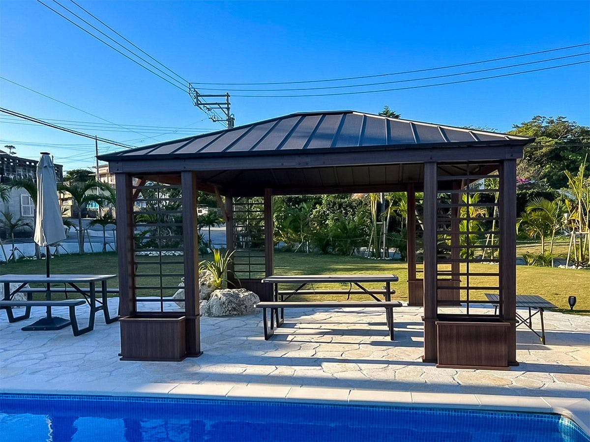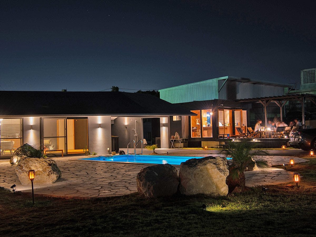 420坪の広々敷地内にBBQのできるテラス、プライベートプールと洗練された大人のためのデザイナーズヴィラです。琉球ゴルフ倶楽部、太平洋・東シナ海いずれのビーチへもアクセス良好です。
