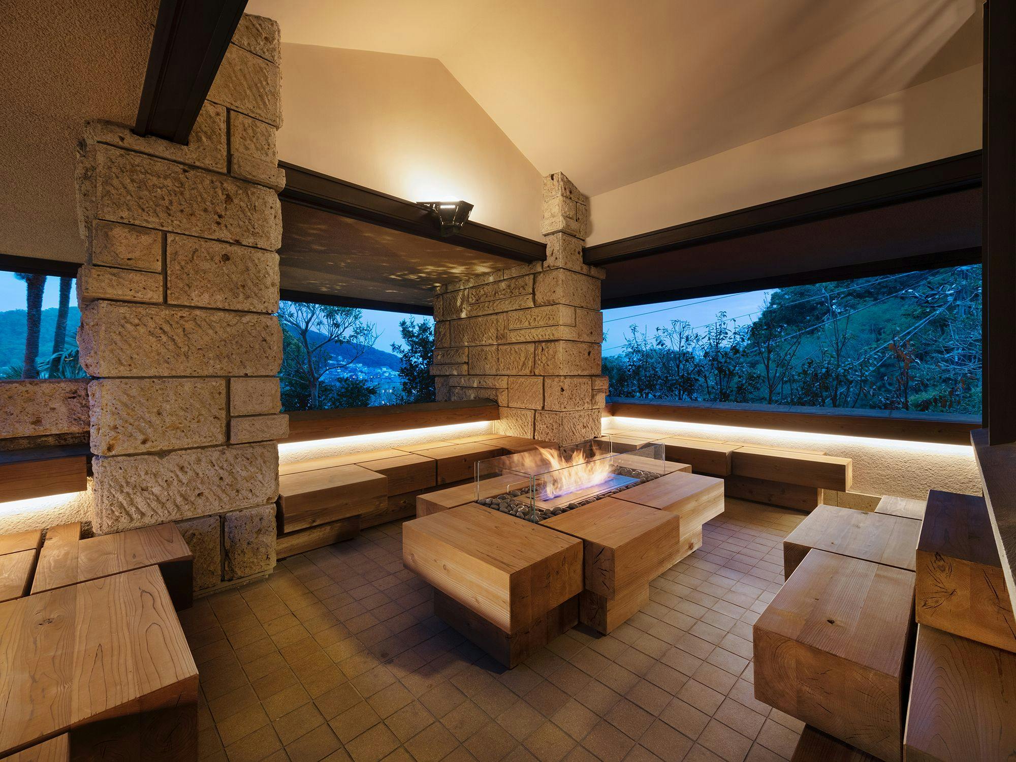 原始的な自然が残る別荘地内に、崖に差し込まれるように建てられた回廊型の建物。展望台のように森に浮かんだリビングと、洞窟のように大地に抱かれたベッドルーム。建物に居ながらにして森と一体となる宿泊体験を。