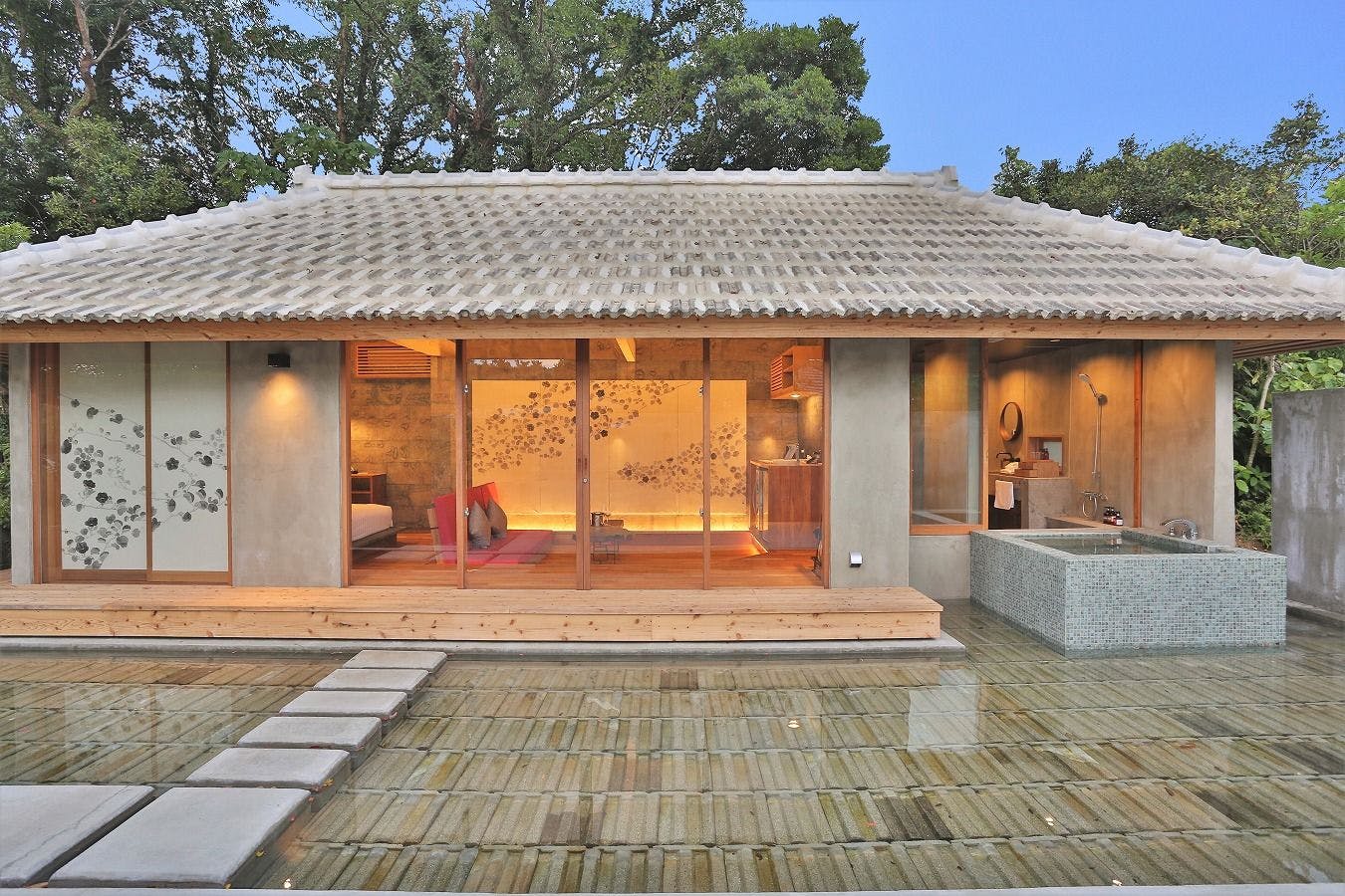 沖縄の原風景が残る屋我地島の静かな集落に佇む翡翠巣。職人による手漉き和紙とやんばる屏風アートの内装が日頃の疲れを癒やしてくれます。隣接レストランでランチやディナーもお楽しみいただけます。