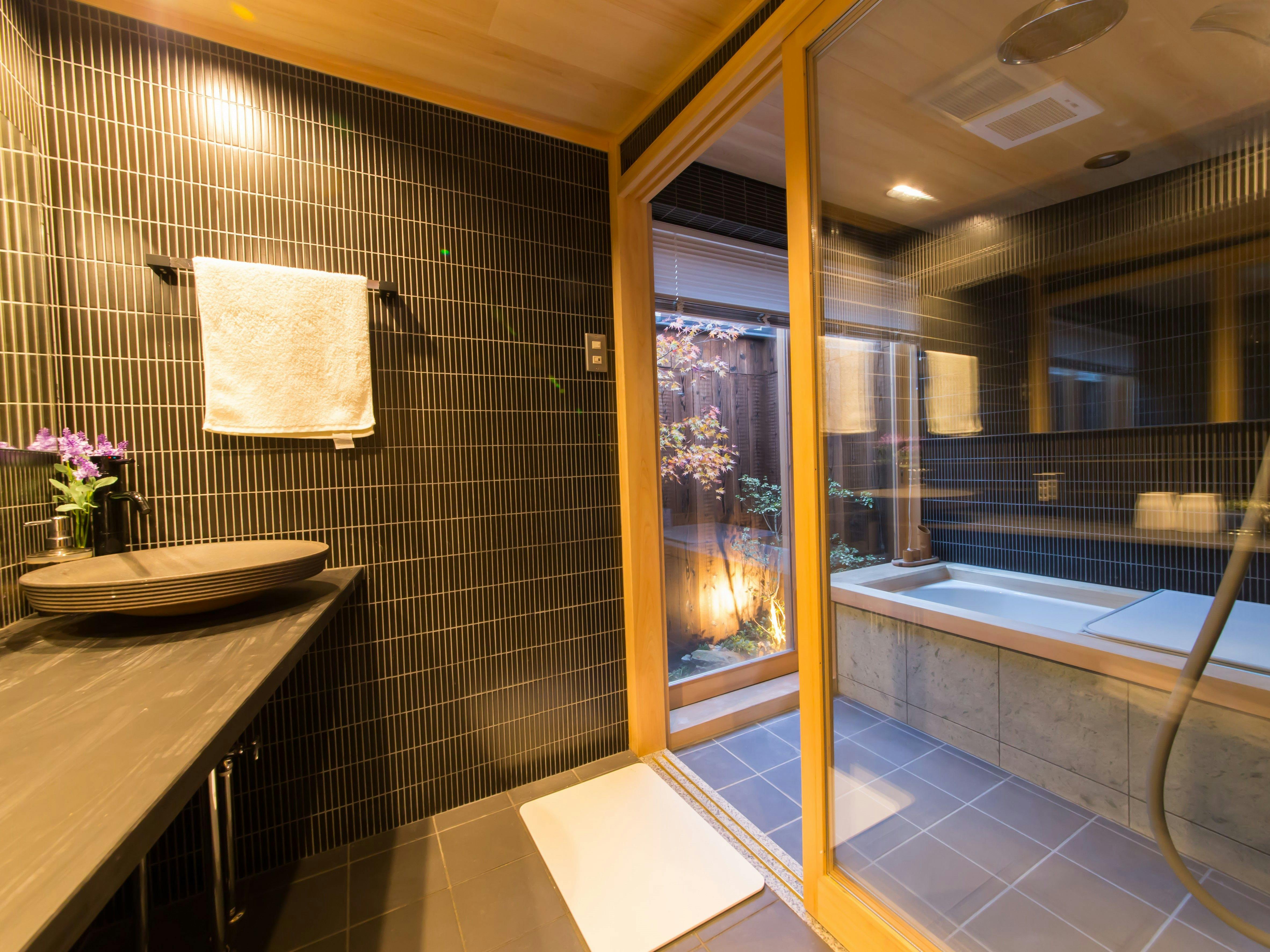 【2018年2月開業】古き良き町並みの中にたたずむ、風情ある京町家の一棟貸し。3つの寝室やキッチンなどを完備。解放感のあるお風呂からは、坪庭を眺められます。