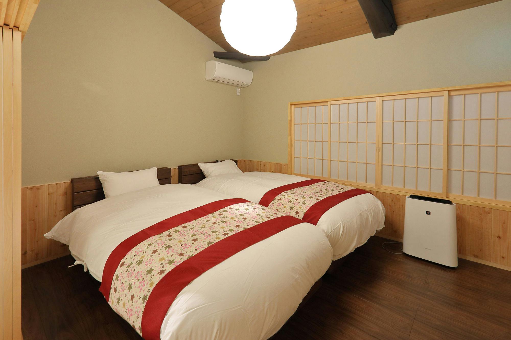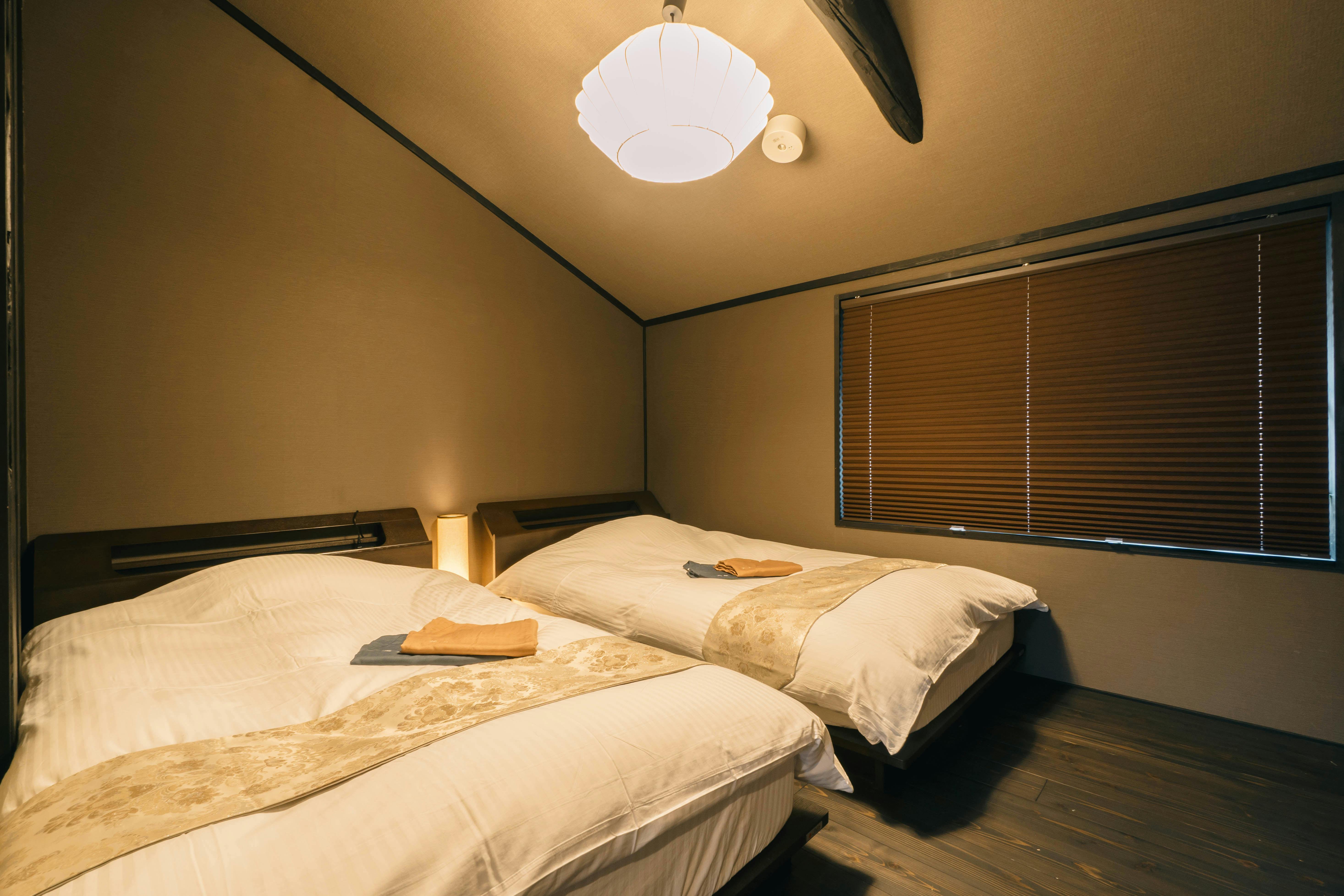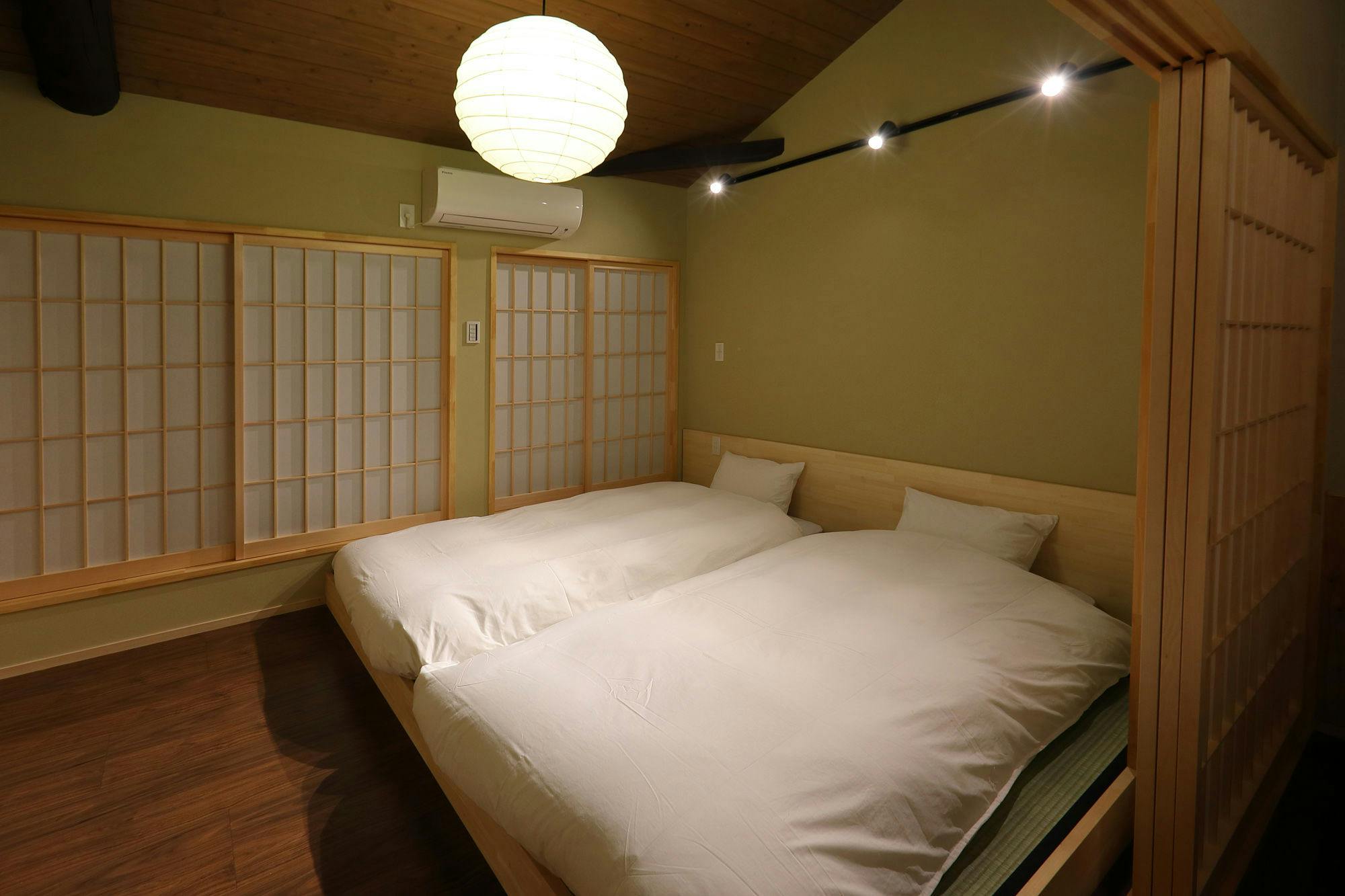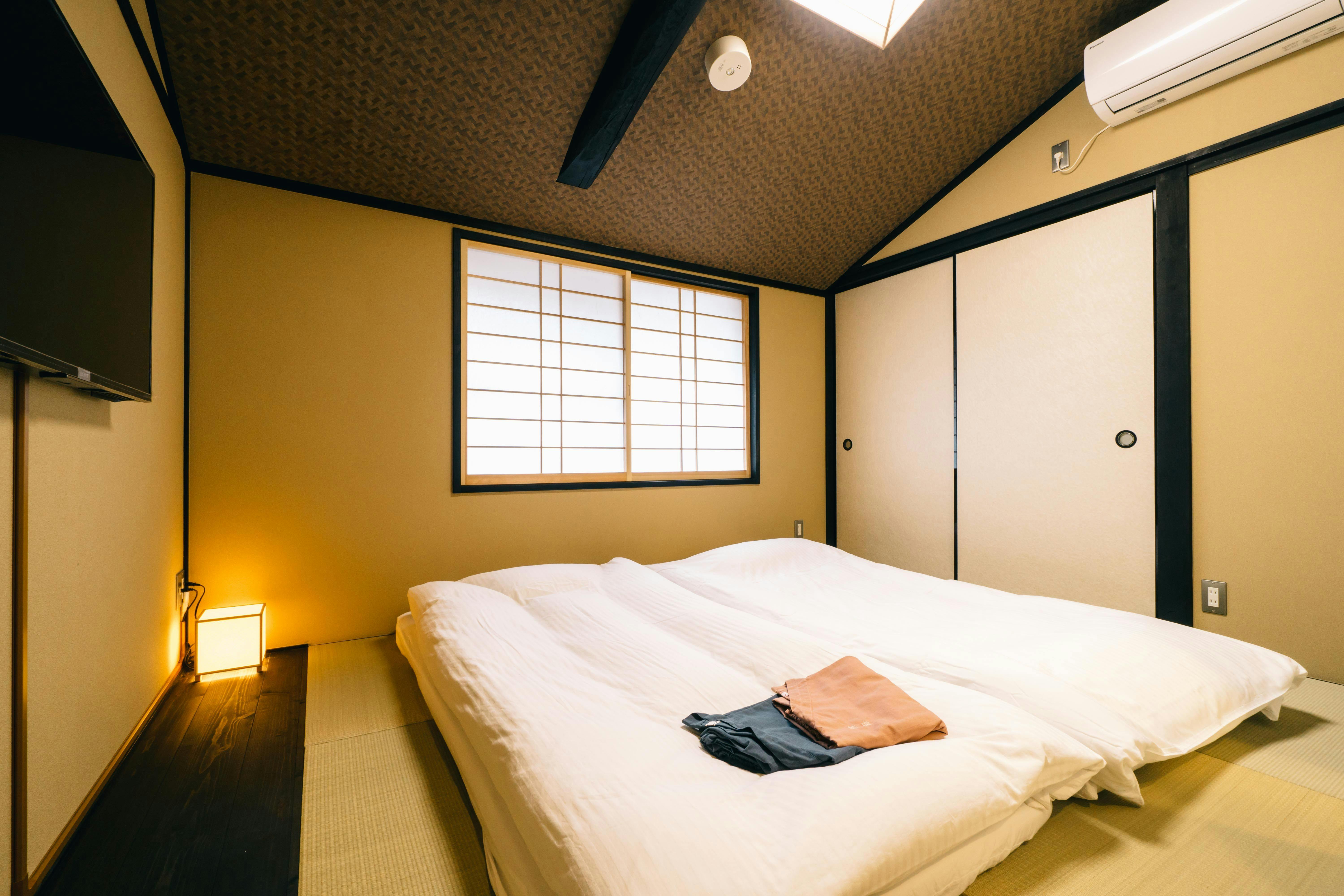 時を重ねた建物だけが纏う独空の気感。古き良き日本建築の趣ある町家。お庭を眺めながらのお風呂には広いジェットバスを、太い梁と高天井が印象的な寝室には世界で愛されるシモンズ社製のベッドをご用意しました。