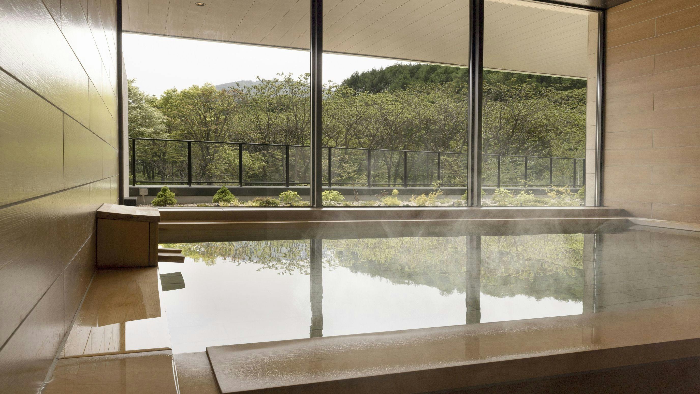 地下2000mから湧き出す自家源泉を14種類の湯めぐりが楽しめる湯の丸にそそぐ。中央の庭園を囲む回廊式の通路に露天風呂や気泡、寝湯、座湯など多彩な湯舟が並びます。