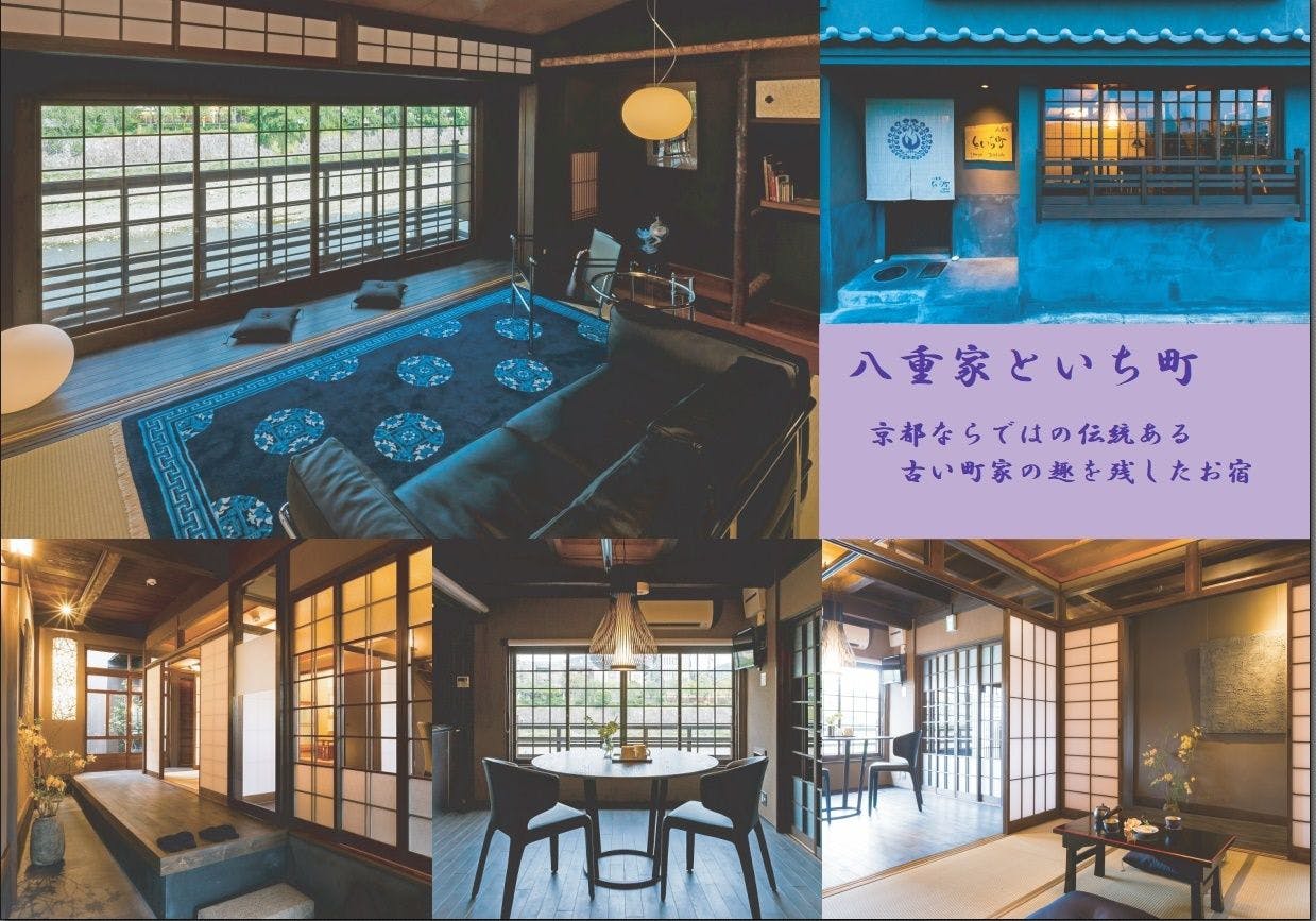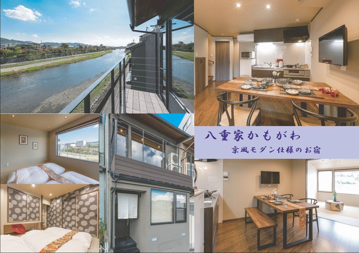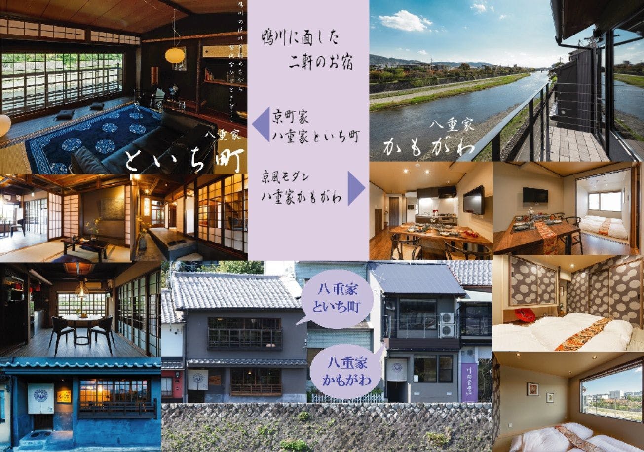 鴨川の絶景を望む二軒のお宿。伝統的な京町屋のしつらえの【八重家といち町】とカジュアルな雰囲気をもつ京風モダン仕様の【八重家かもがわ】お好みのお宿でまるで京都に暮らすような滞在をお楽しみください。