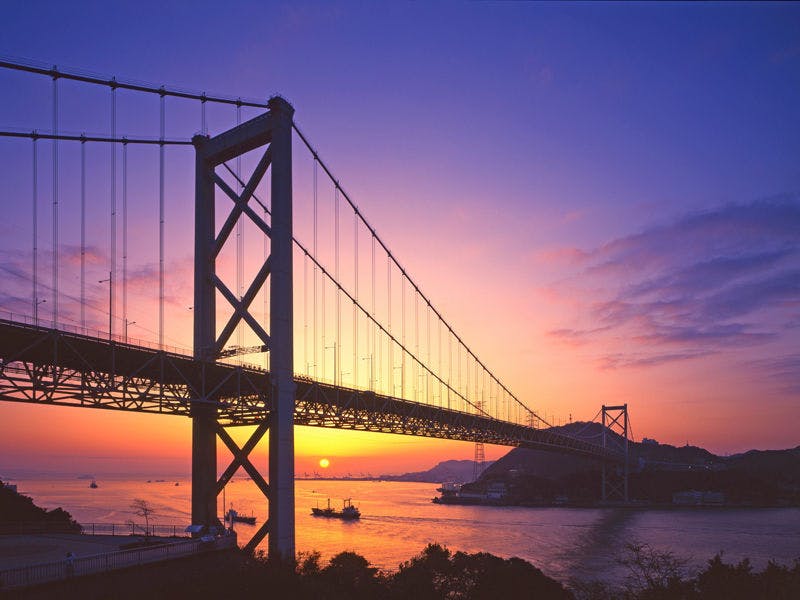 瀬戸内海国立公園の山の山麓に位置する満珠荘。全面ガラス張りのレストランをはじめ、お部屋、浴場から関門海峡を一望できます。「地産地消」の旬の食材を使用したお食事や、観光地への好アクセスも魅力です。