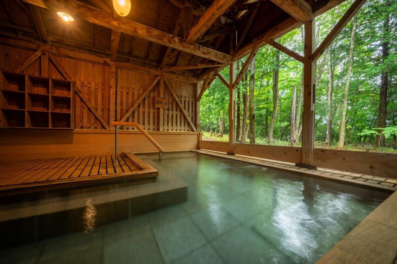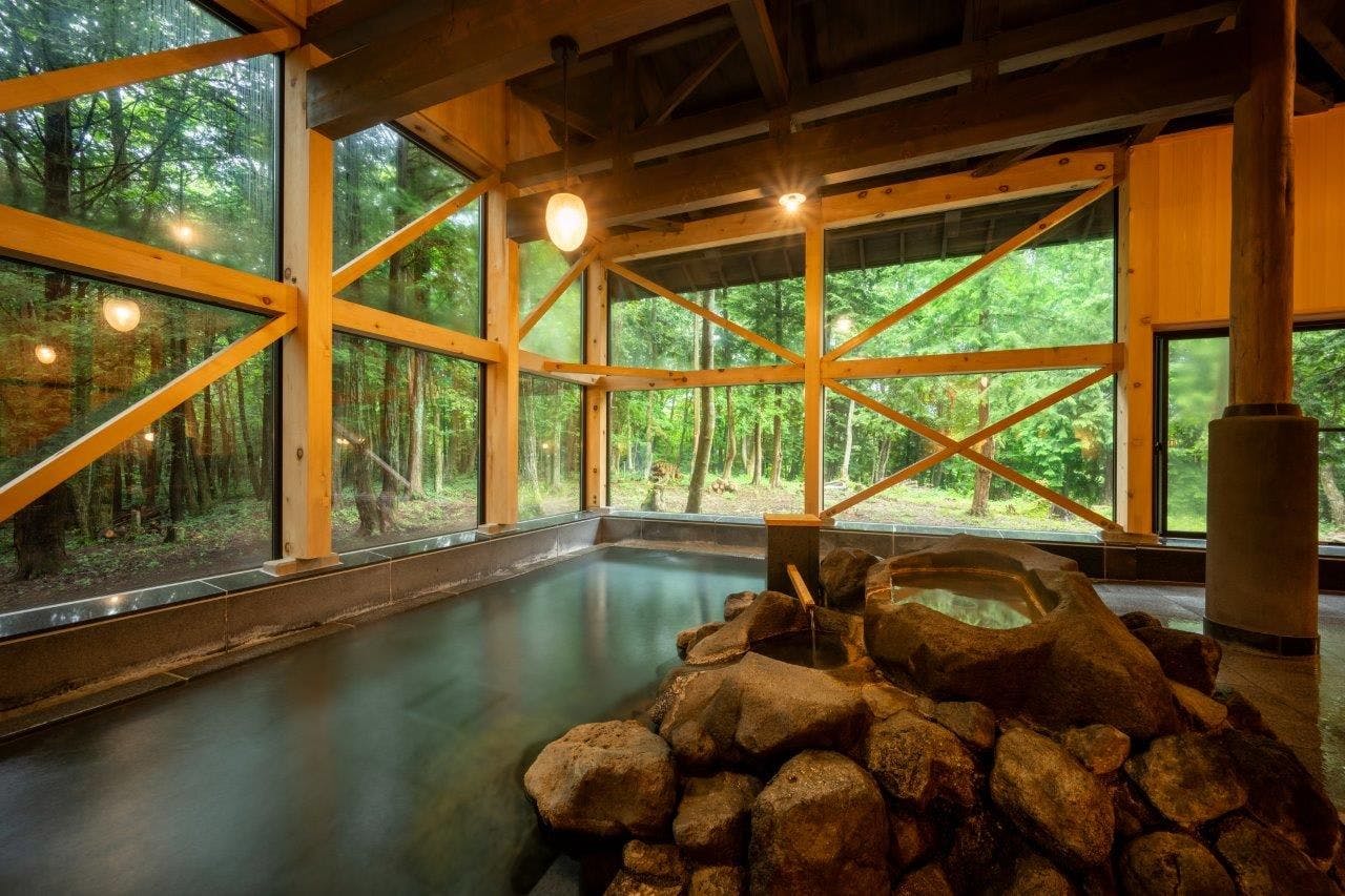 雄大な森に佇むモダン造りの高原リゾート。建物のフォルムは宮沢賢治の童話「銀河鉄道の夜」の線路がモチーフ。最上階の展望風呂からは四季の山々が望め、木々に囲まれた露天風呂では森林浴を楽しめます。