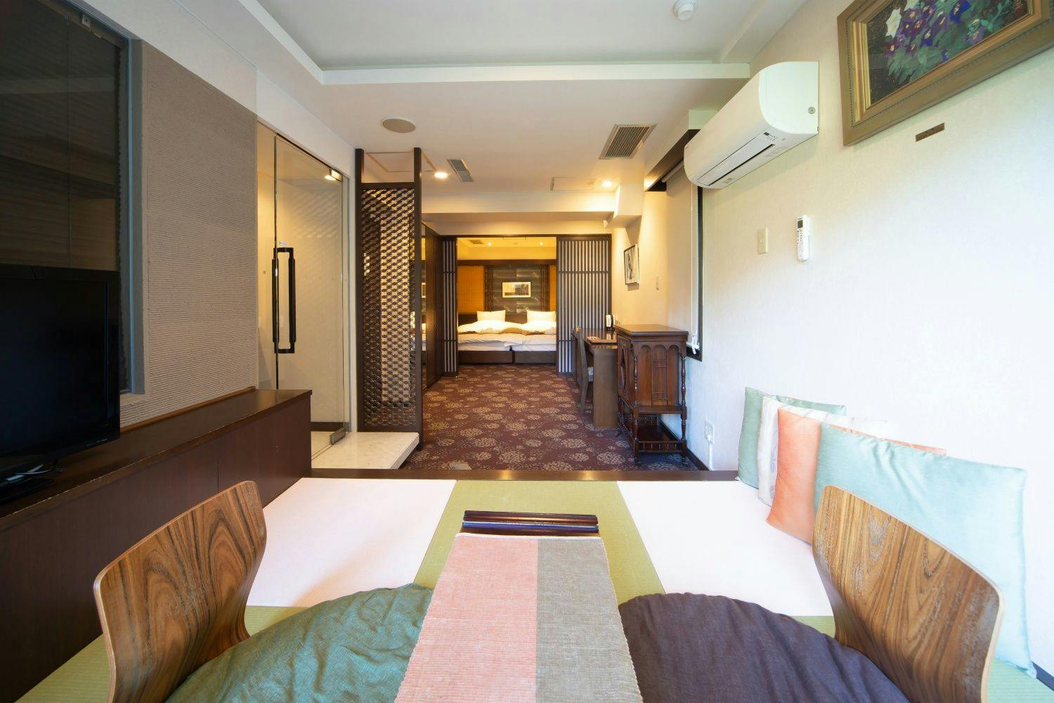 阪急嵐山駅の目の前。京風情あふれる天然温泉の和風ホテル。市内で唯一、趣の異なる5つの貸切風呂のご利用が無料です。夕食は四季夕膳会席&おばんざい・天ぷらが食べ放題!