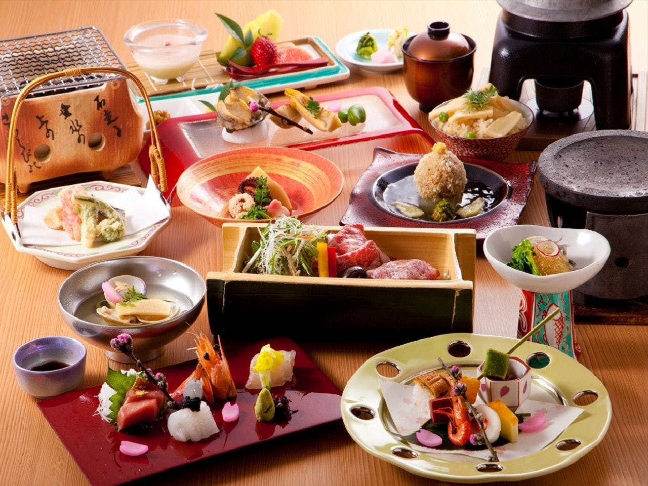 5000坪に10部屋広い自然庭園と築地より仕入れの食材を使用し、月替りの懐石料理や器、露天風呂付離れ家や貸切露天風呂等もあります。
