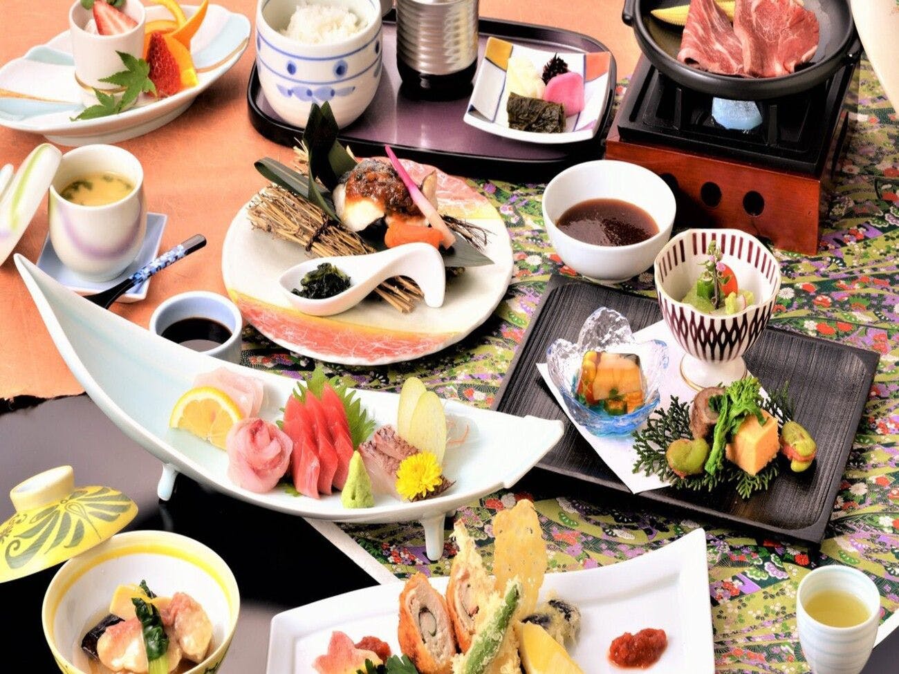 高台から海を望む絶景は熱川温泉で随一。すべてのお部屋、また大浴場や露天風呂が海側に面し、 季節ごとの景色をご覧いただけます。お料理は伊豆の海の幸をふんだんに使用し、素材の味をご堪能いただけます。
