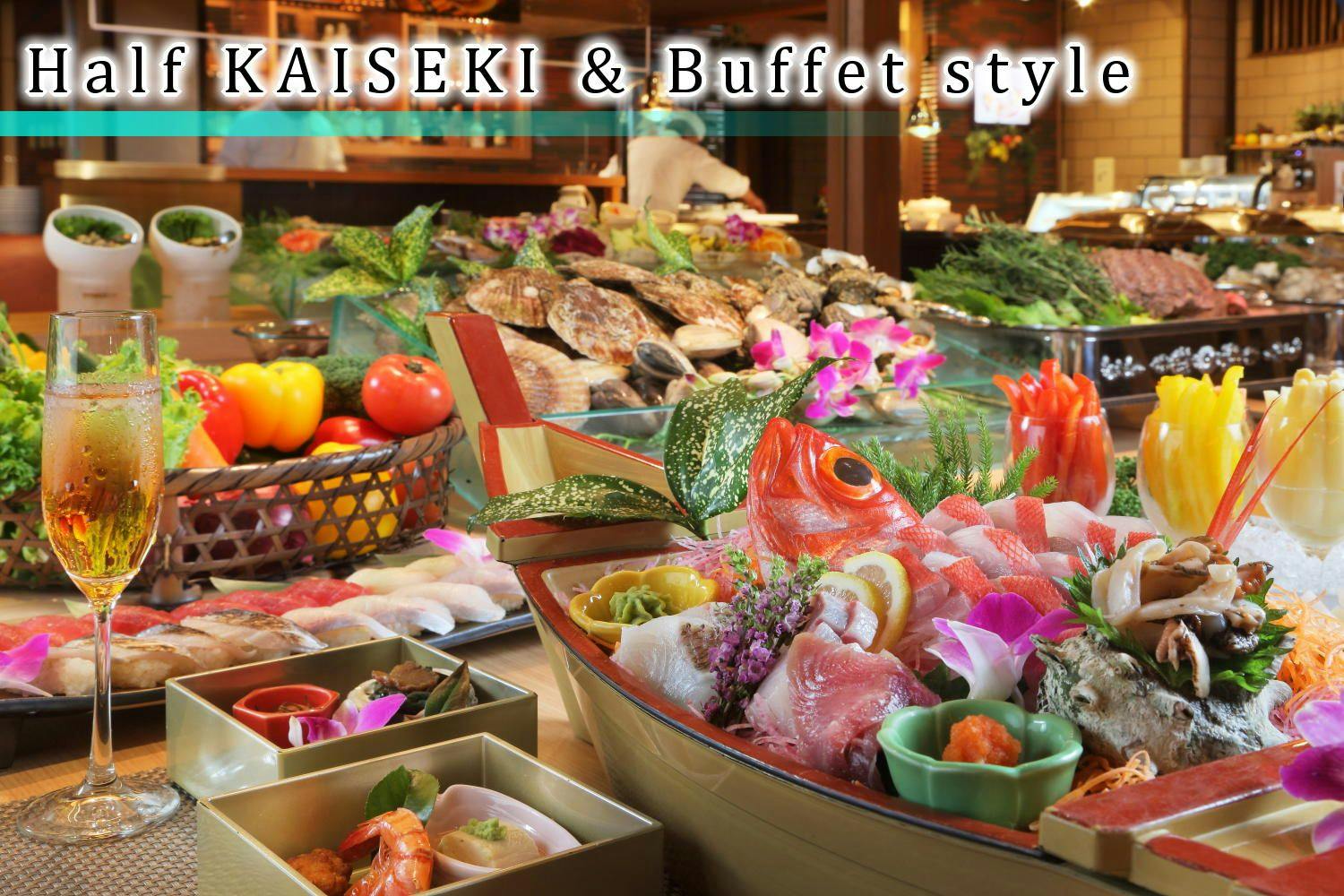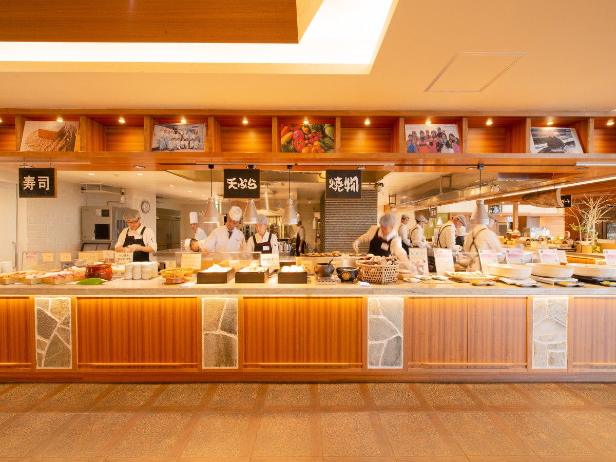 絶景の展望露天風呂と新鮮な地魚を楽しむなら「千里の風」。会席とブッフェバイキングのいいとこどり。夕食は「ハーフ会席&ハーフブッフェ」。カップルからファミリーまでおすすめ。貸切露天風呂もあり。