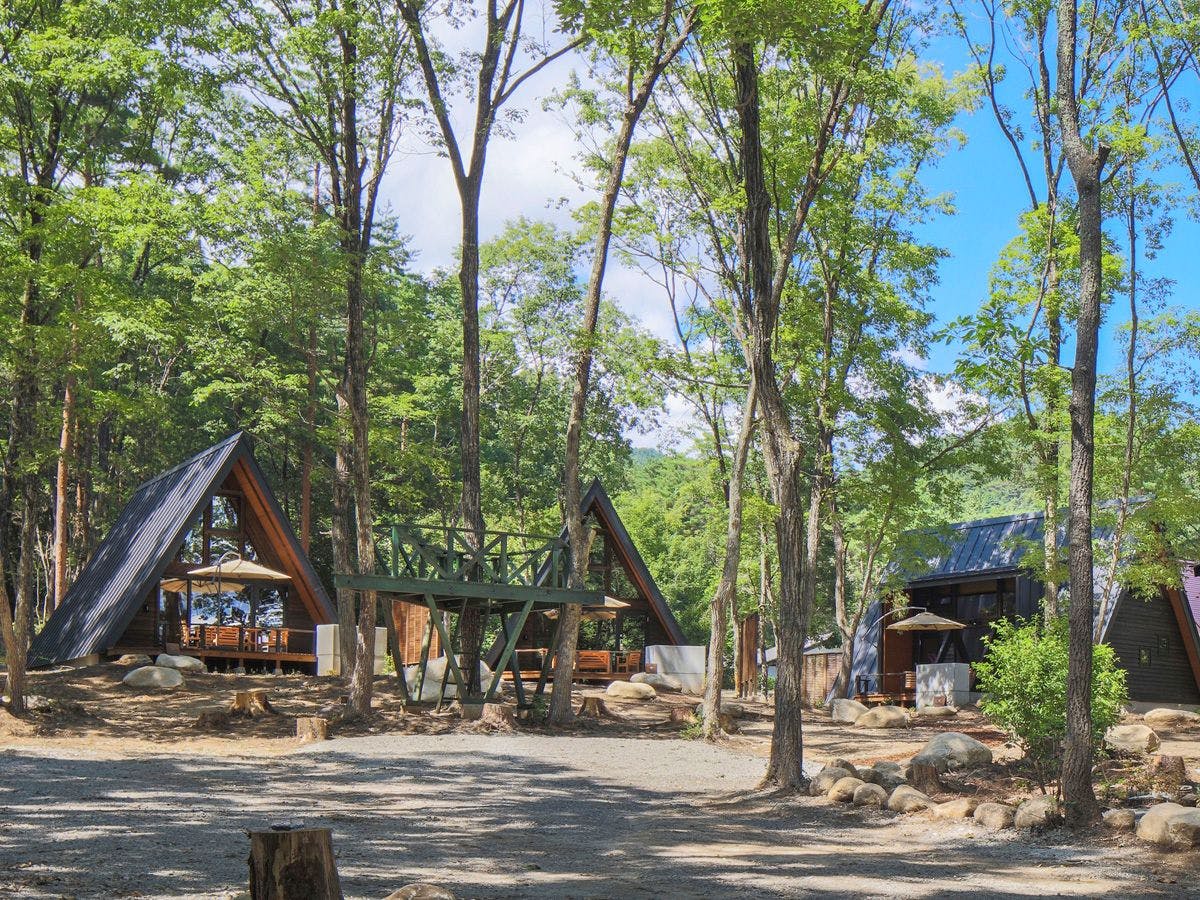 安曇野の森の中に溶け込むユニークな三角屋根の貸別荘。各棟に源泉100%のプライベート天然温泉、テラスには備え付けBBQコンロがございます。大人も子供も一緒に静かで贅沢なひと時をお楽しみください