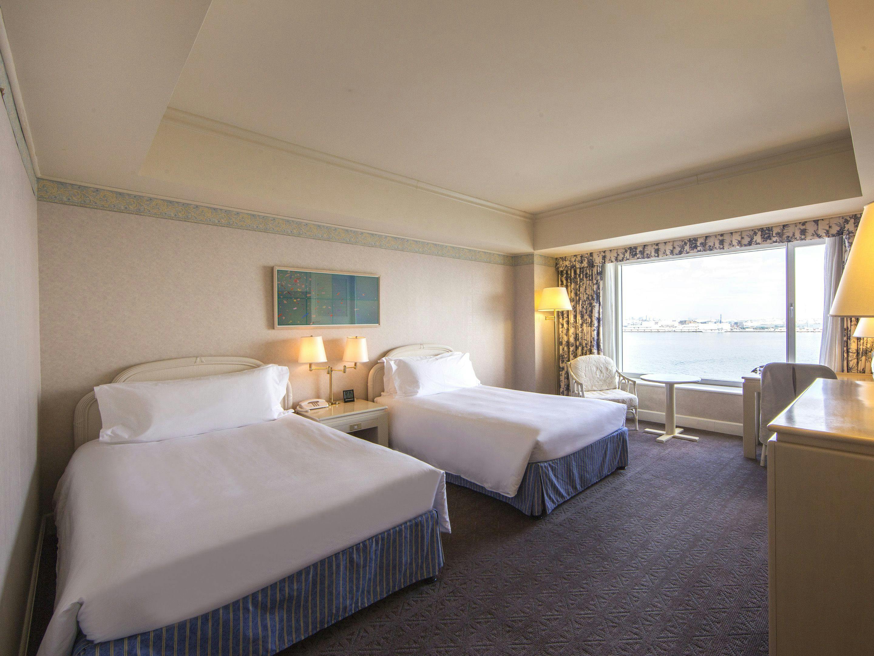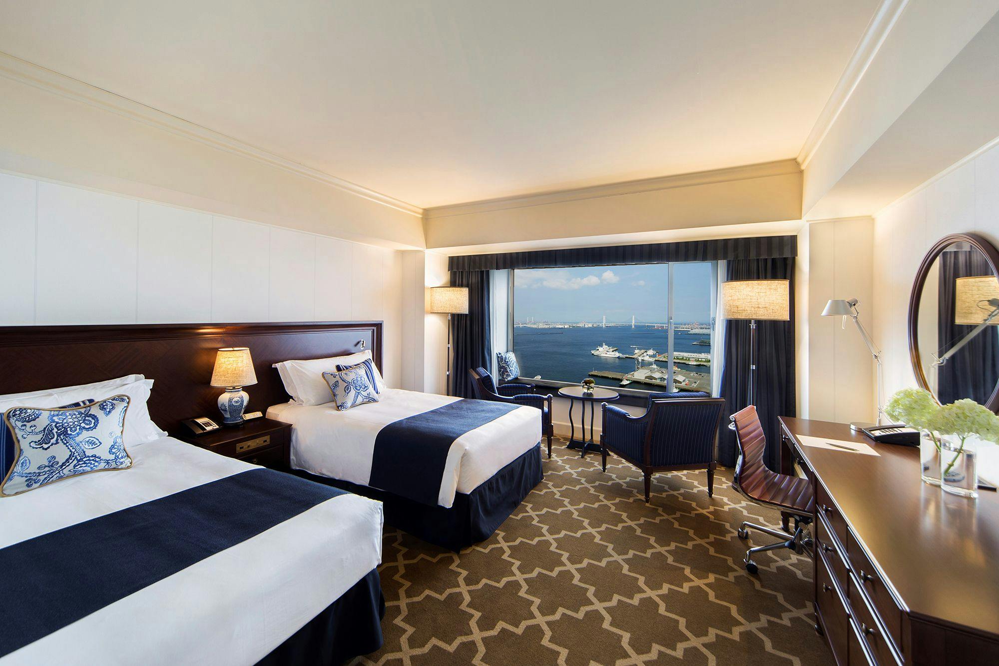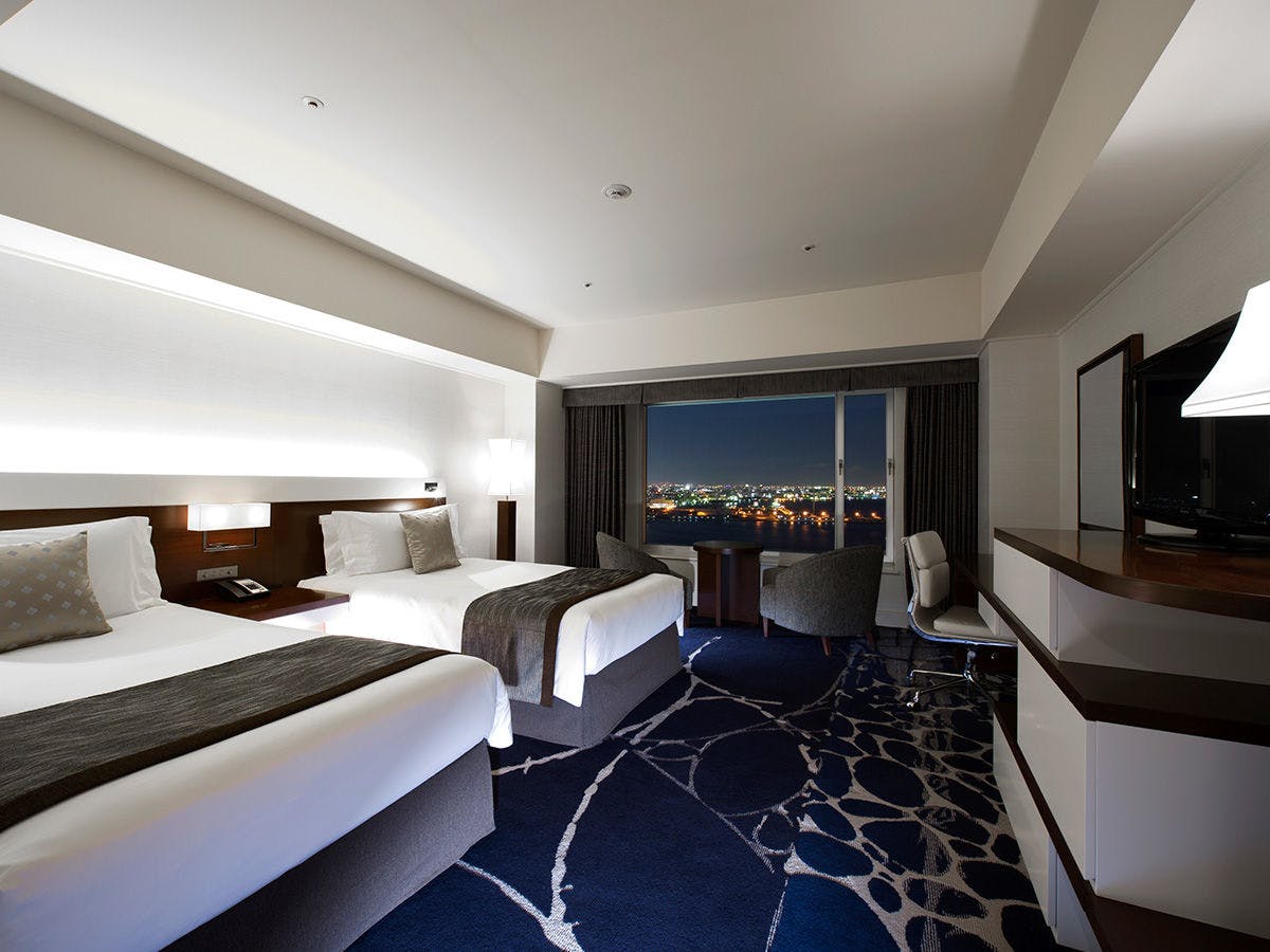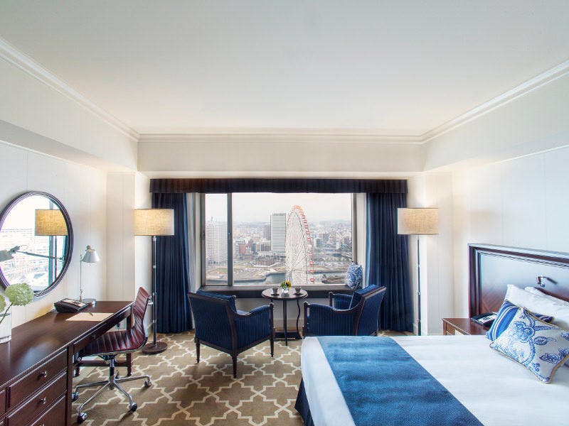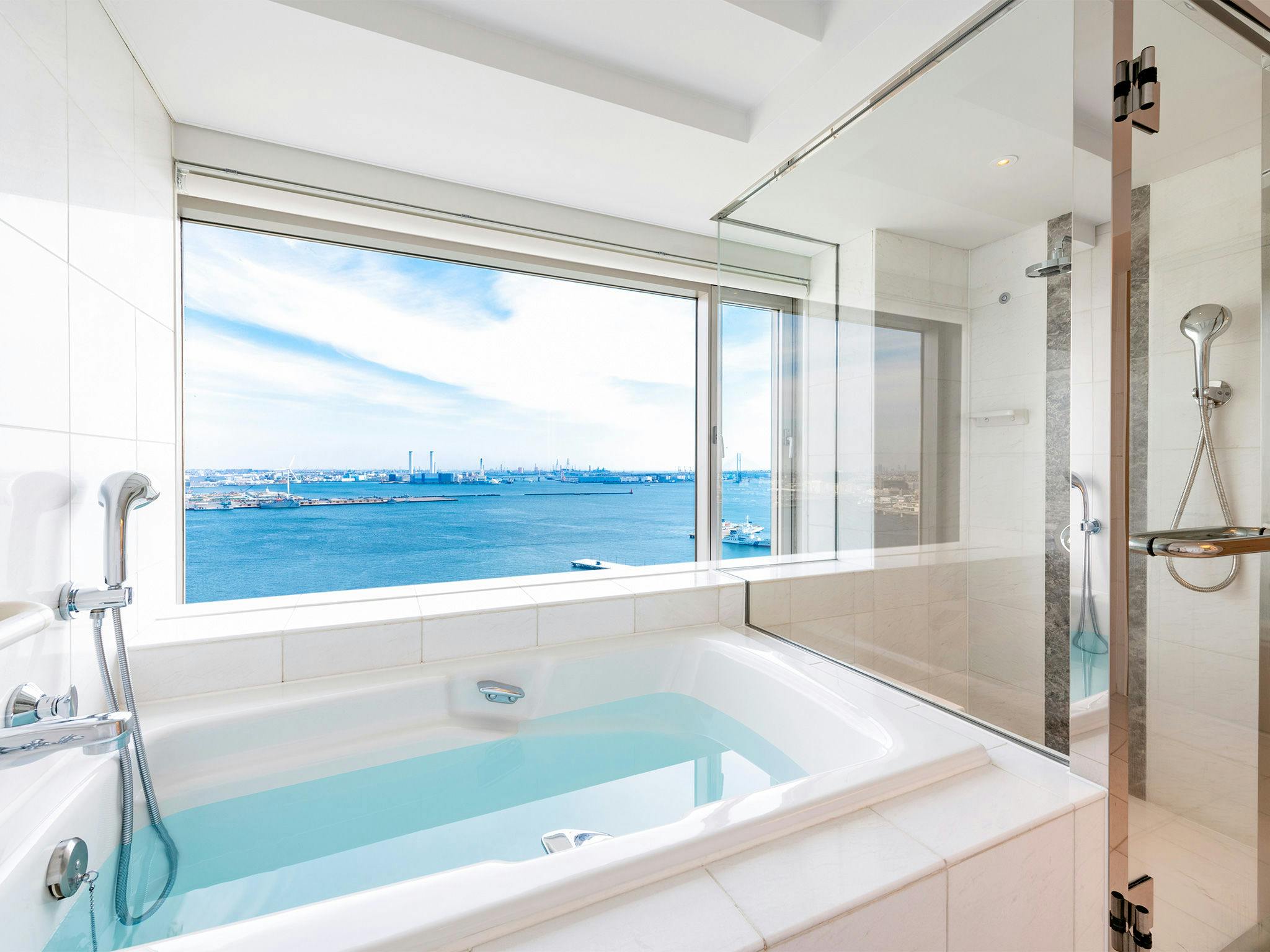 ホテルの先端部に位置する客室では、船が行き交う海の景色と、観覧車など市街地のイルミネーションの両方をご覧いただけます。海に面したバスルームからは横浜港を一望でき、バスタブに浸かれば、まるで海に浮遊するような体験をしていただけます。
