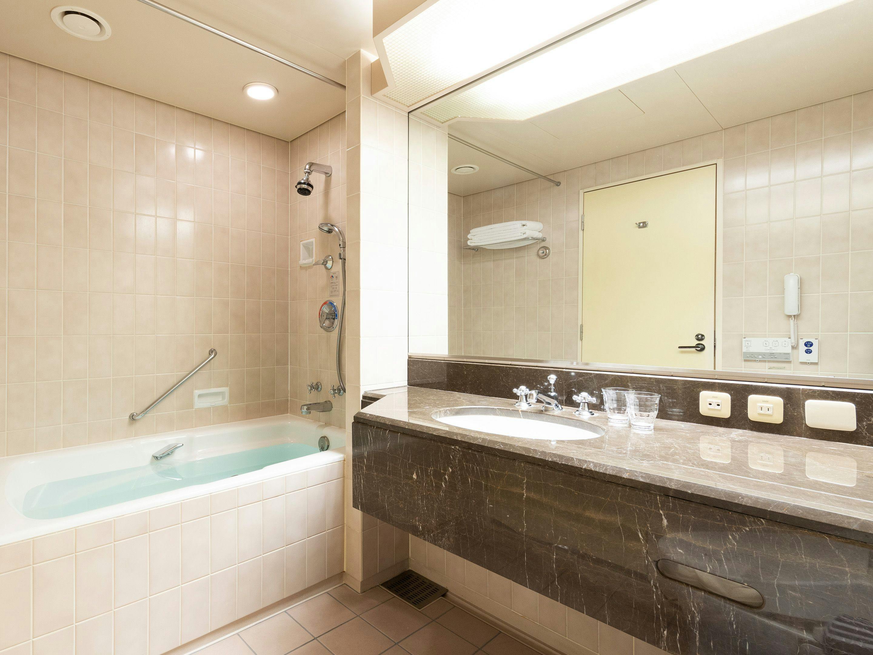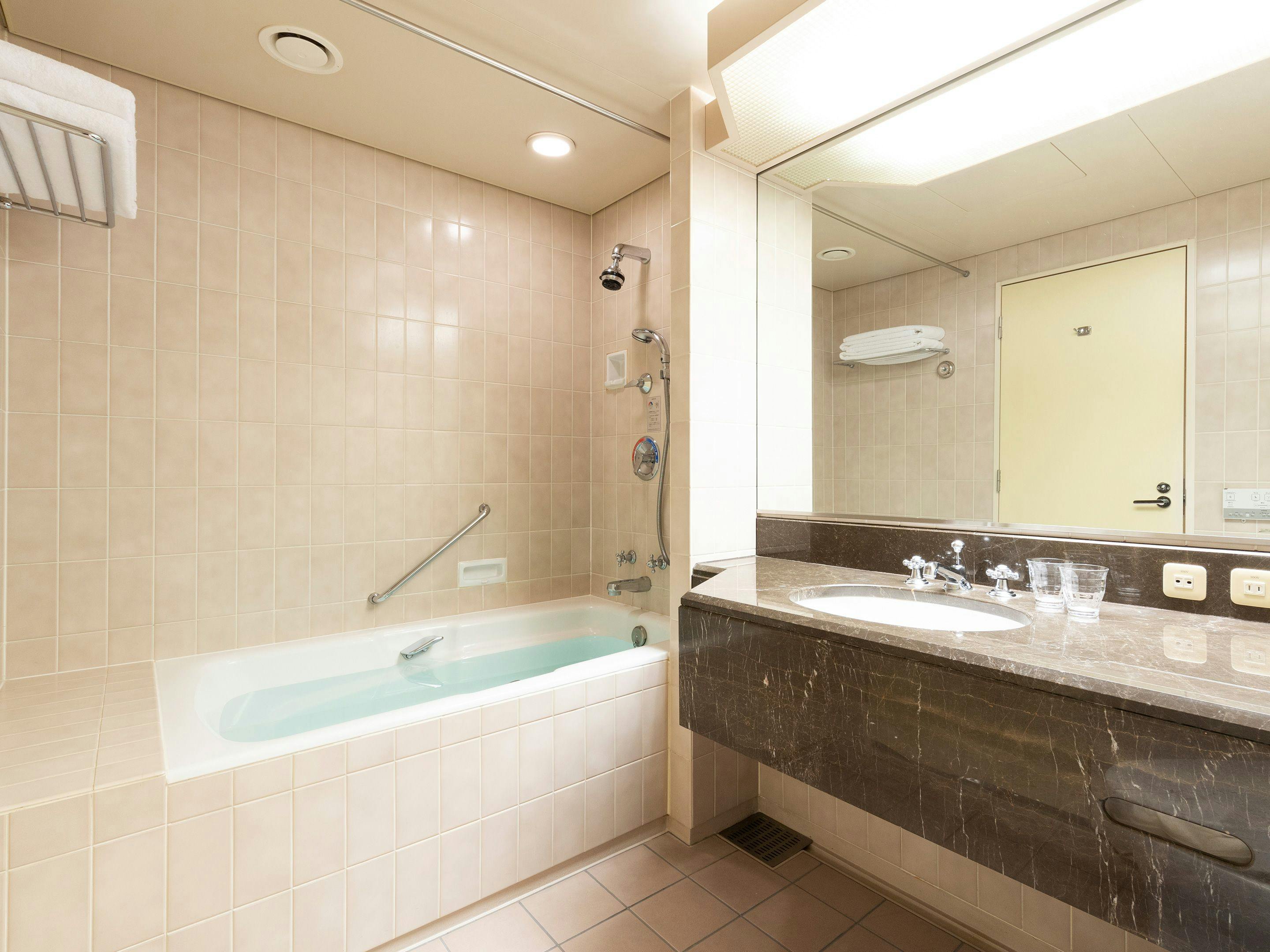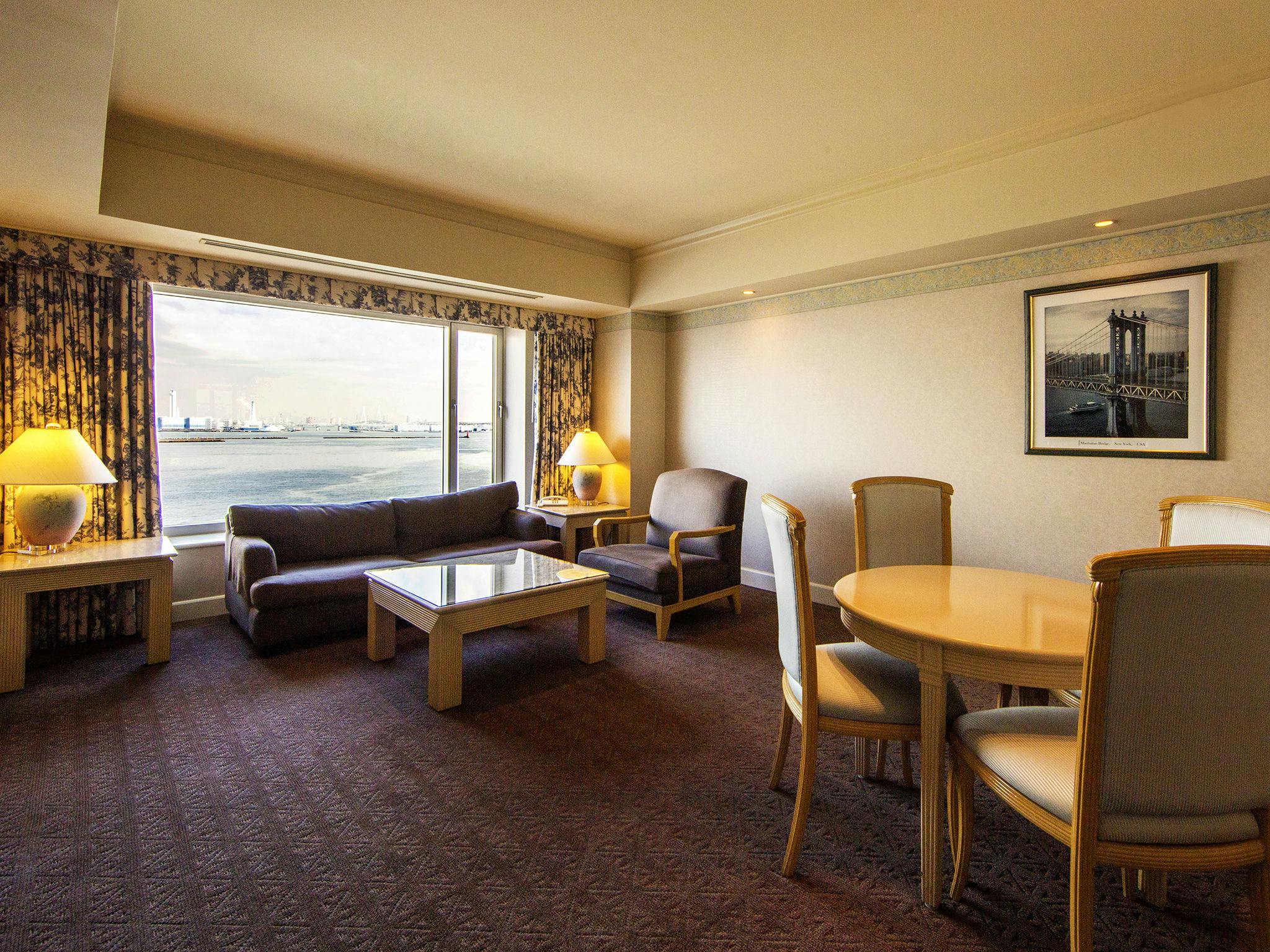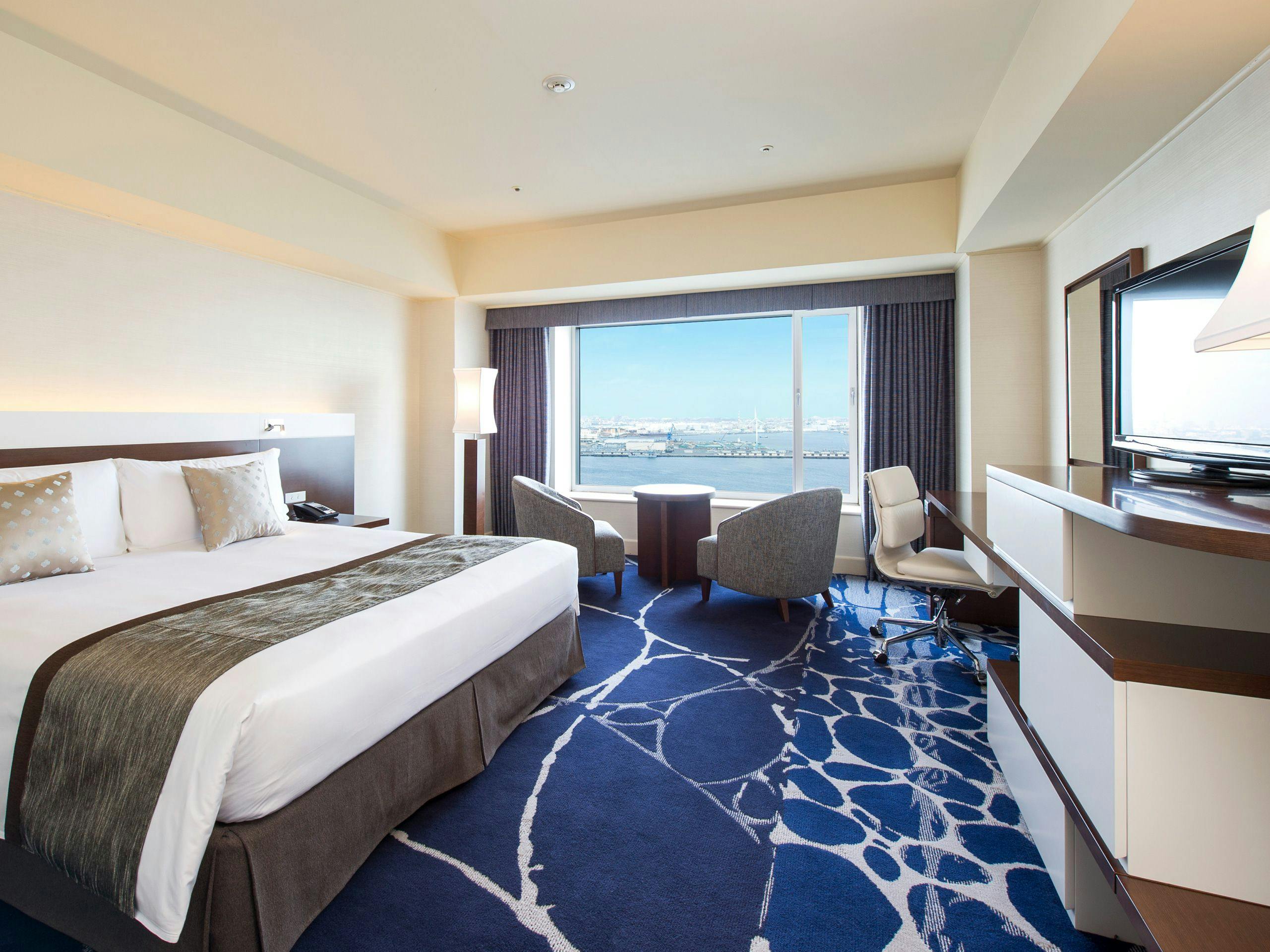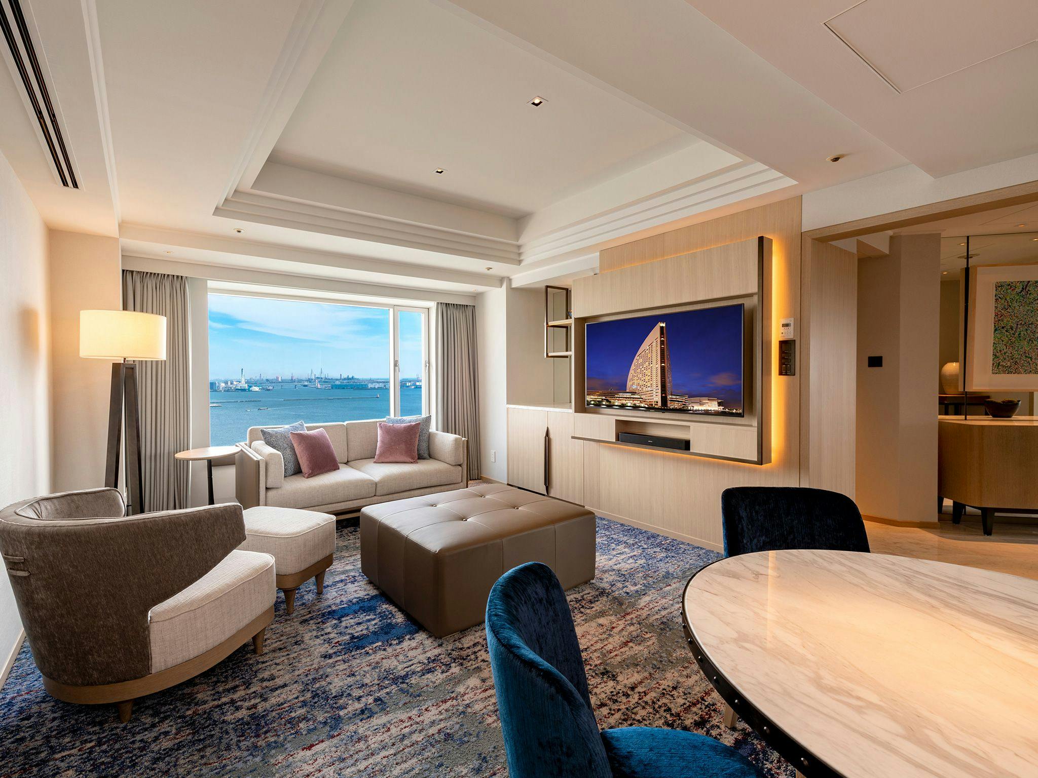 ホテルの先端部に位置する客室では、船が行き交う海の景色と、観覧車など市街地のイルミネーションの両方をご覧いただけます。海に面したバスルームからは横浜港を一望でき、バスタブに浸かれば、まるで海に浮遊するような体験をしていただけます。