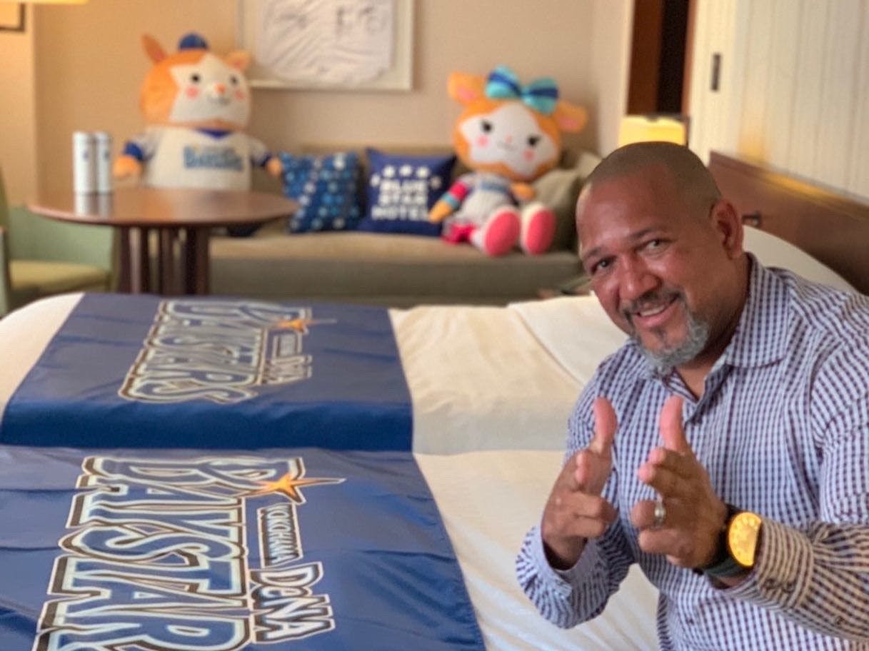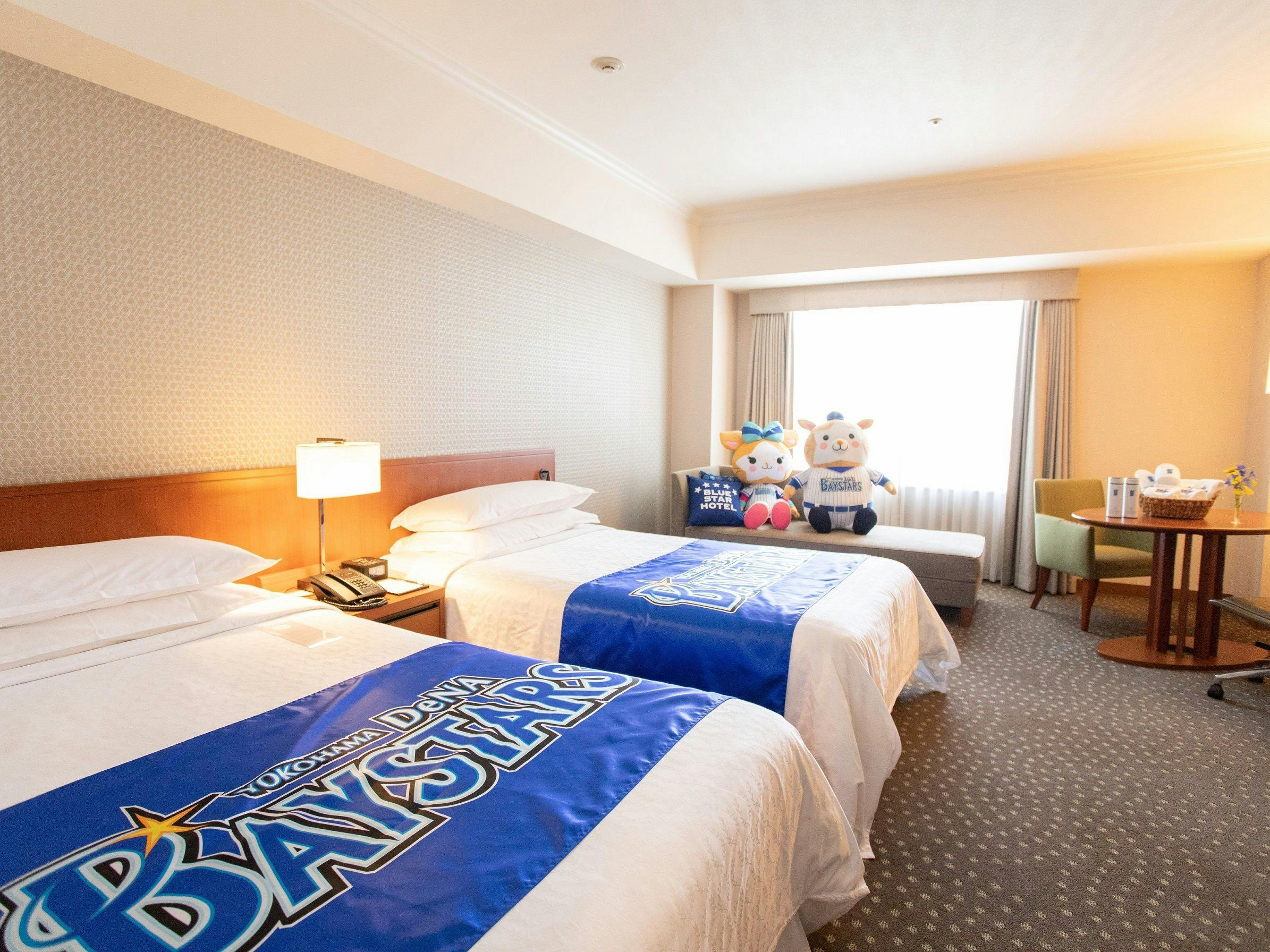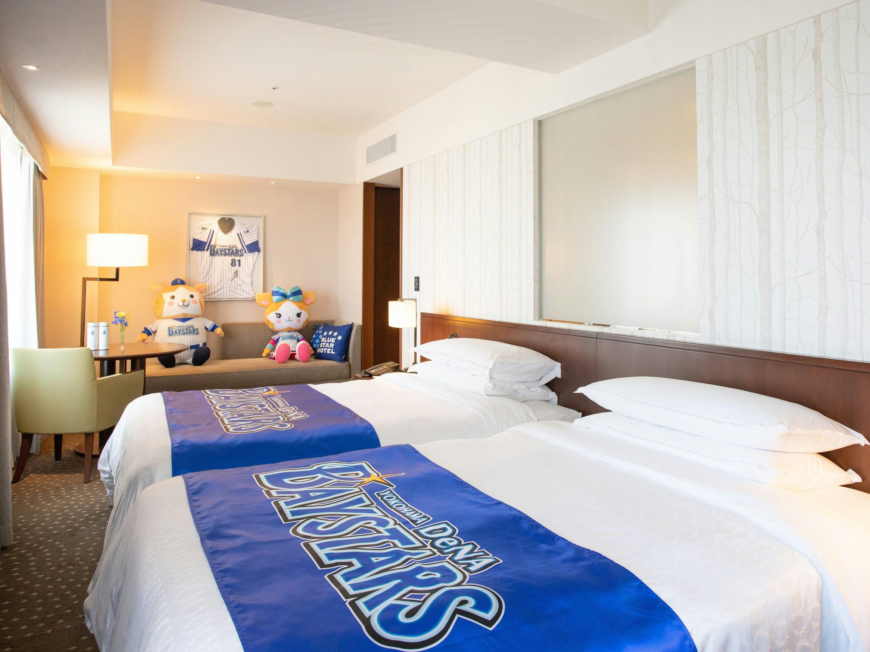 46平米の広々とした客室に入ると、横浜DeNAベイスターズ球団マスコット、特大サイズのDB.スターマンとDB.キララがお出迎え。