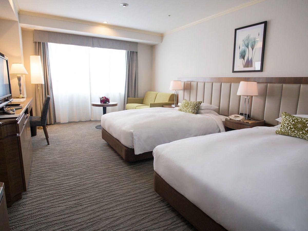 120cm幅のベッドが2台シーリー社の抗菌効果のあるポリジン加工ベッドをご用意ベッドが可動式なためハリウッドツイン、ダブルとしても利用可能バスルームはセパレートタイプエキストラベッド1台収容可能3名様でご宿泊の場合は正ベッド2台とエキストラベッド1台でのご用意となります。