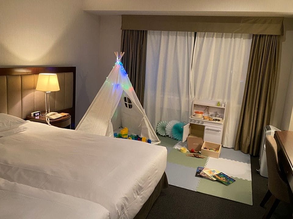 31.5平米のツインルームのソファスペースをプレイマットを敷いたキッズスペースに変えた、小さなお子様も安心のお部屋です。120センチ幅のベッド2台をくっつけたハリウッドツイン仕様でご用意いたします。