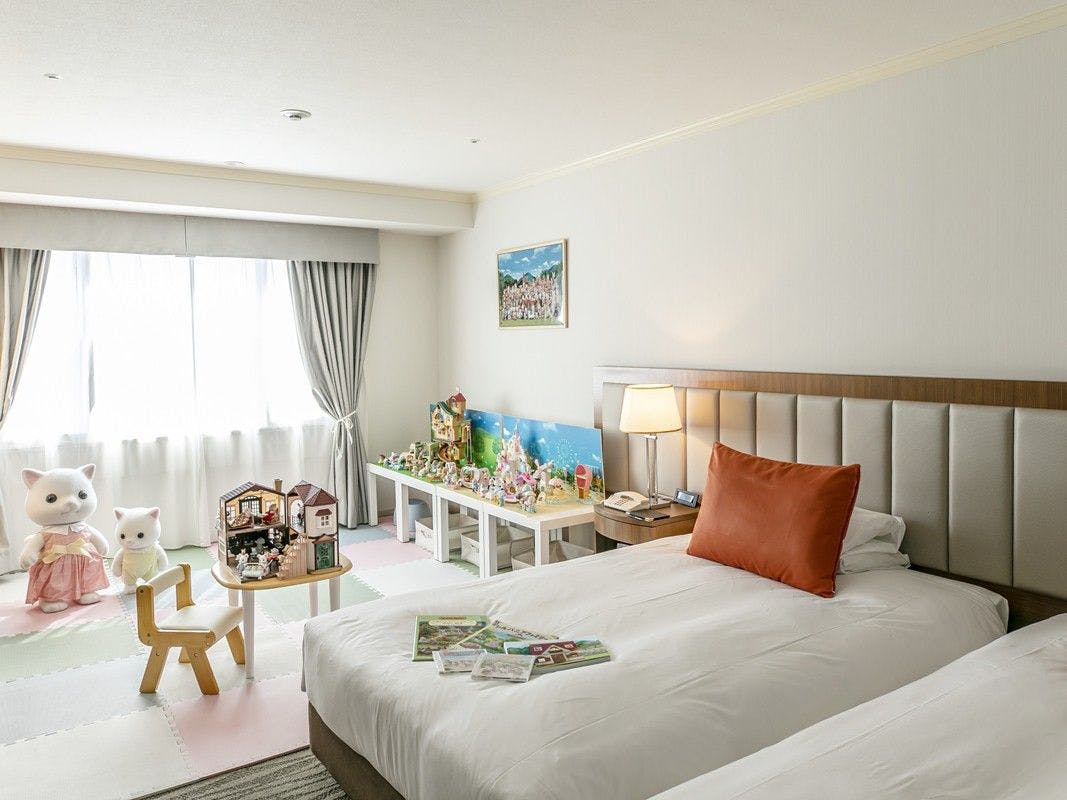 31.5平米のツインルームのソファスペースをプレイマットに置き換え、シルバニアファミリーのお人形や家具などをたくさんご用意しております。120センチ幅のベッド2台をくっつけたハリウッドツイン仕様でご用意いたします。