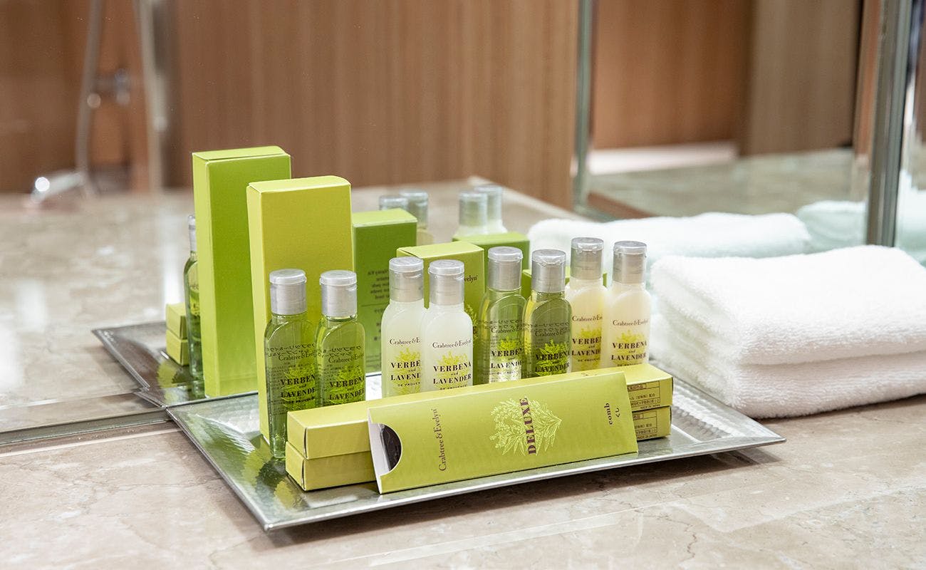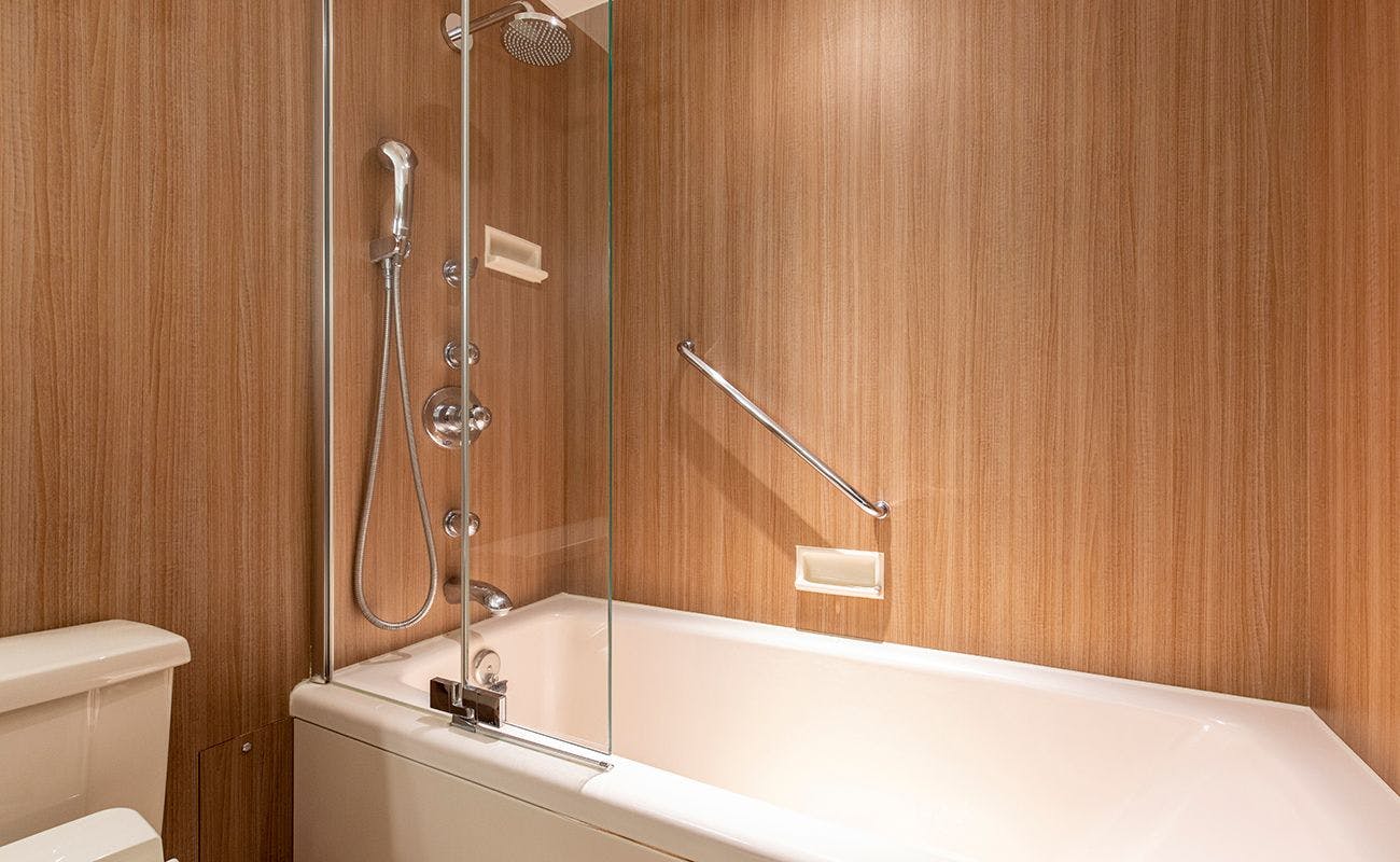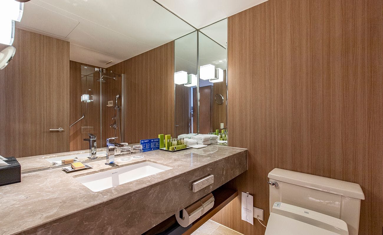 インテリアは城郭や侍といった、古(いにしえ)の名古屋の歴史からインスピレーションを得た落ち着いた色彩で、客室のデザインは、わび・さび(侘・寂)の要素を意識した心地よい空間です。バスルームには、独立型シャワーブース、日本式のバスタブ、トイレ、洗面台を有する4ポイント・バスを導入。広々としたバスルームはお客さまの心もからだも解き放つ、くつろぎの空間を目指しました。全米売上No.1のマットレスブランド、サータ社のヒルトン・セレニティベッドが上質な眠りへといざないます。