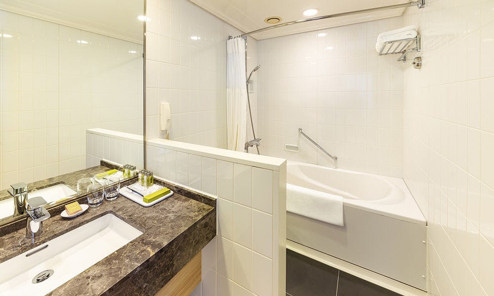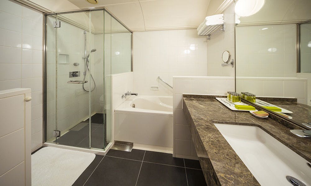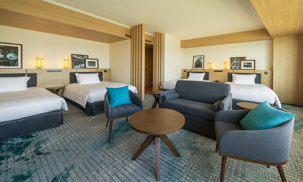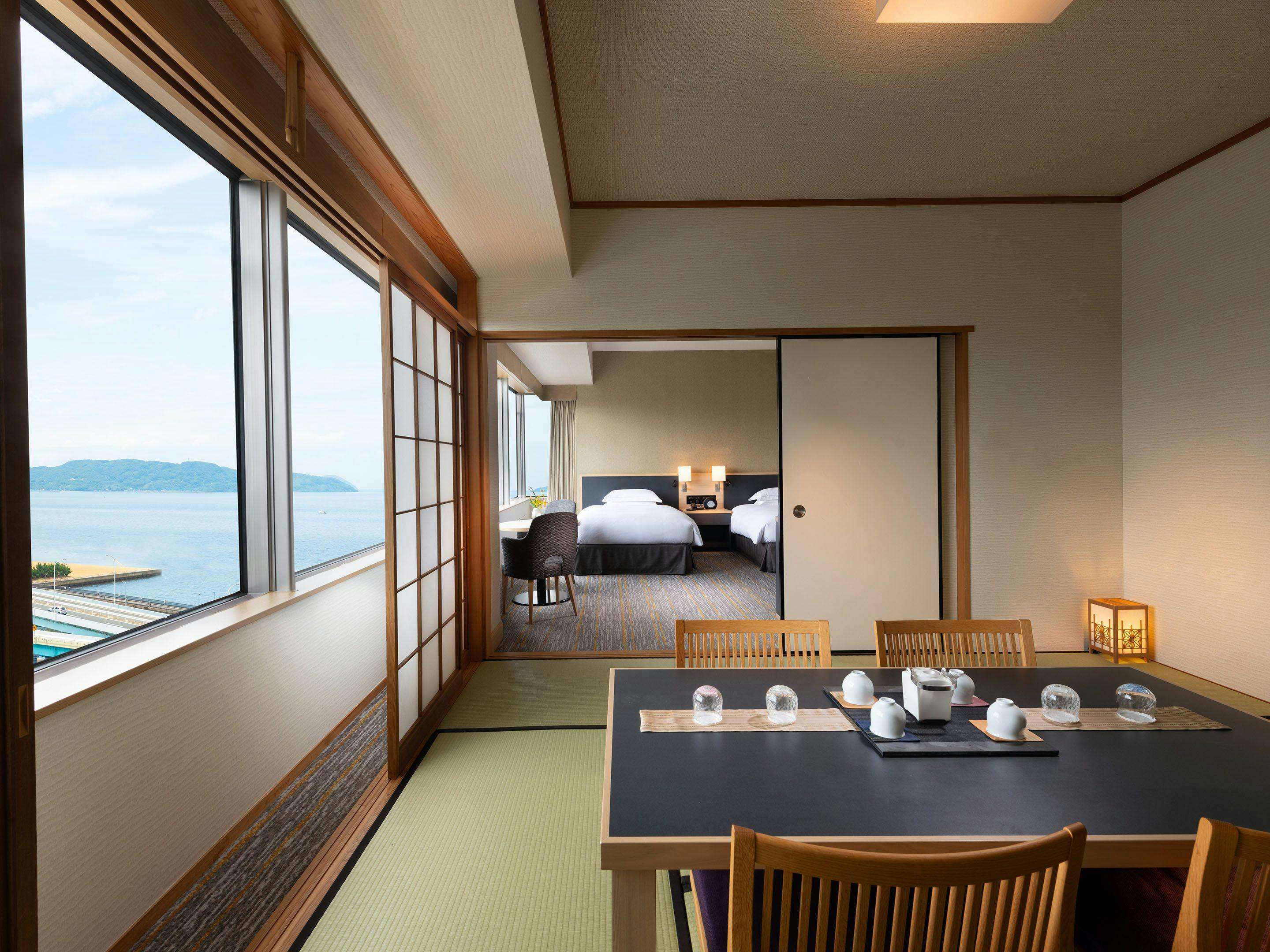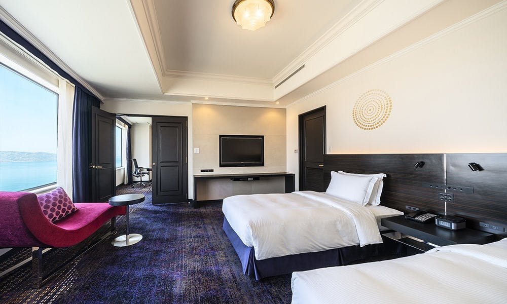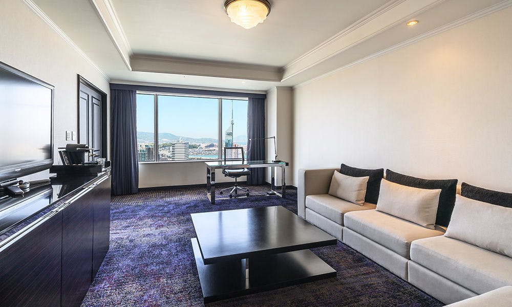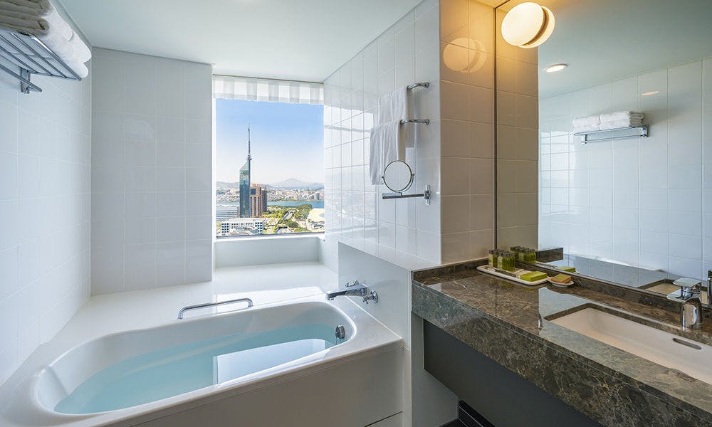 大人気オーシャンビュージェットバスが魅力のエグゼクティブスイートルーム。バスルームから博多湾が一望でき移り行く景色をお楽しみいただけます。ワンランク上の贅沢なひと時をお過ごし下さい。
