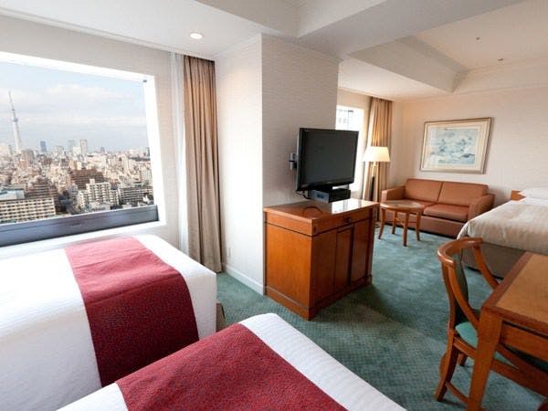 100cm幅の正規ベッド2台をつけて並べたお部屋です。寝返りをうってもベッドの揺れが軽減され、相手に与える影響が少なく人気です。東京スカイツリー側のお部屋へのご案内となります。※天候により東京スカイツリーをご覧いただけない場合がございます。インターネット接続無料(Wi-Fi接続可)/加湿空気清浄機完備【添寝のご宿泊】未就学のお子様2名までとさせていただきます