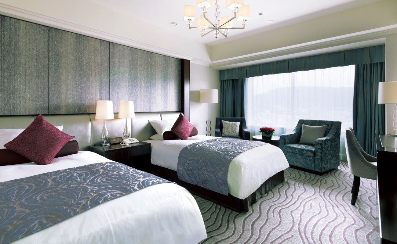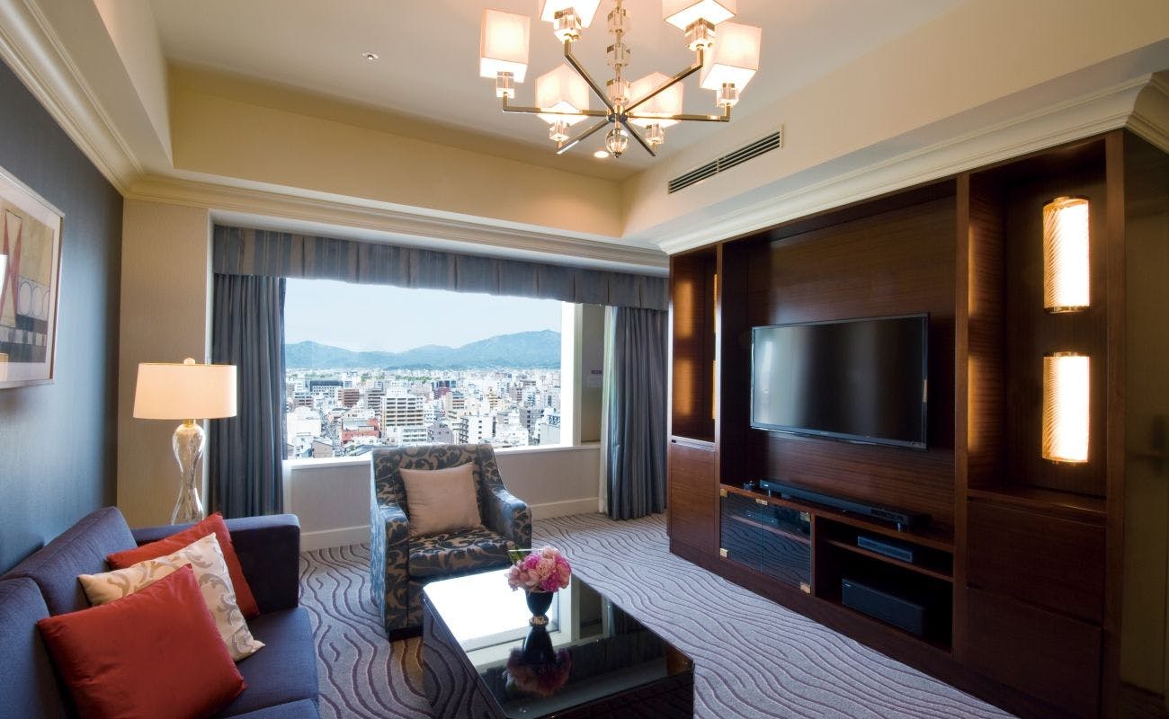 東山や京の街並みを望む客室。館内は和とヨーロピアンイメージが調和し落ち着きと安らぎに満ちています。