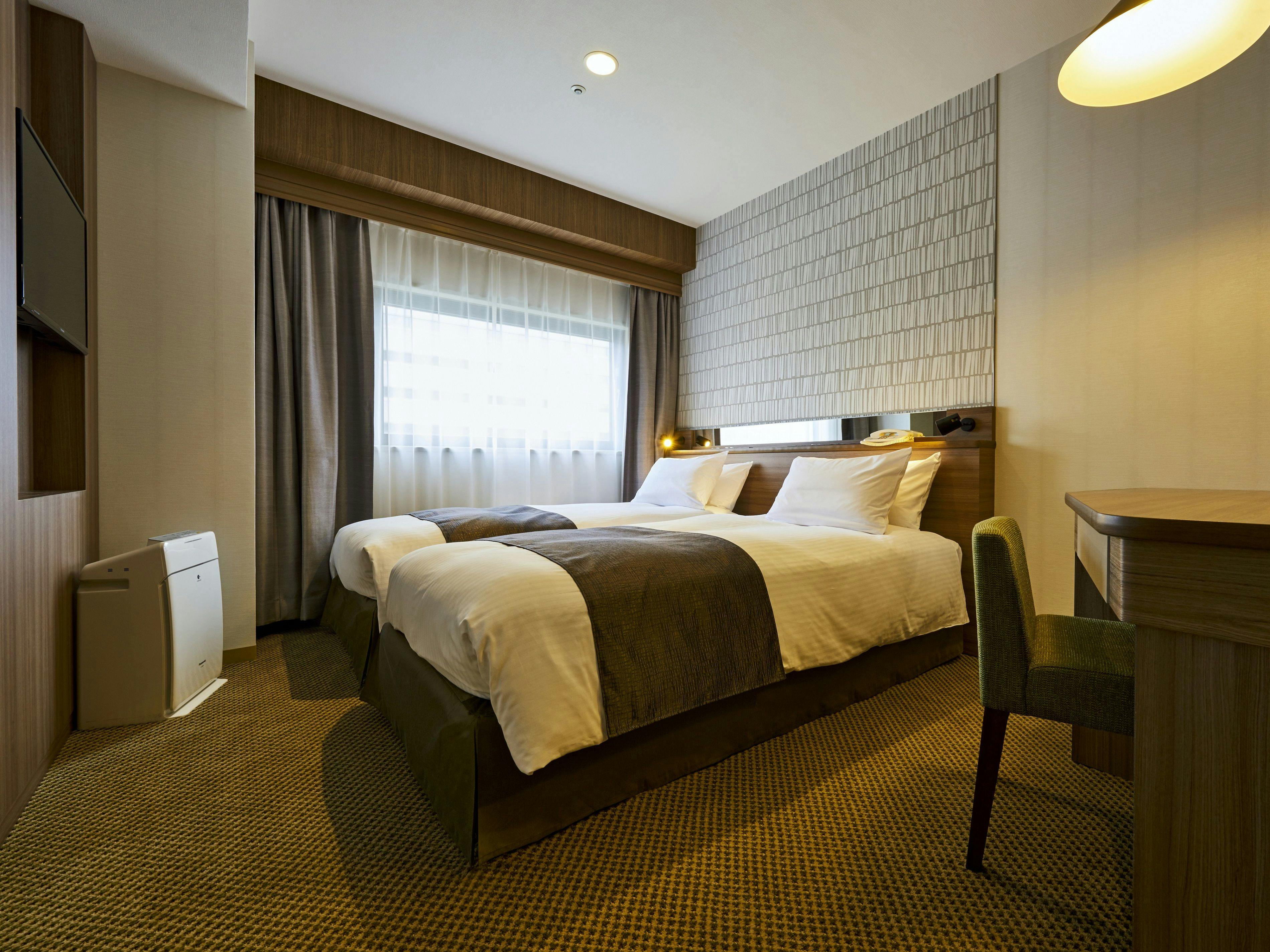 シックで落ち着きのあるコンパクトなツインルーム。■2018年プチリニューアル■シングルベッド(幅97cm)×2台■広さ20平米■26型液晶TV
