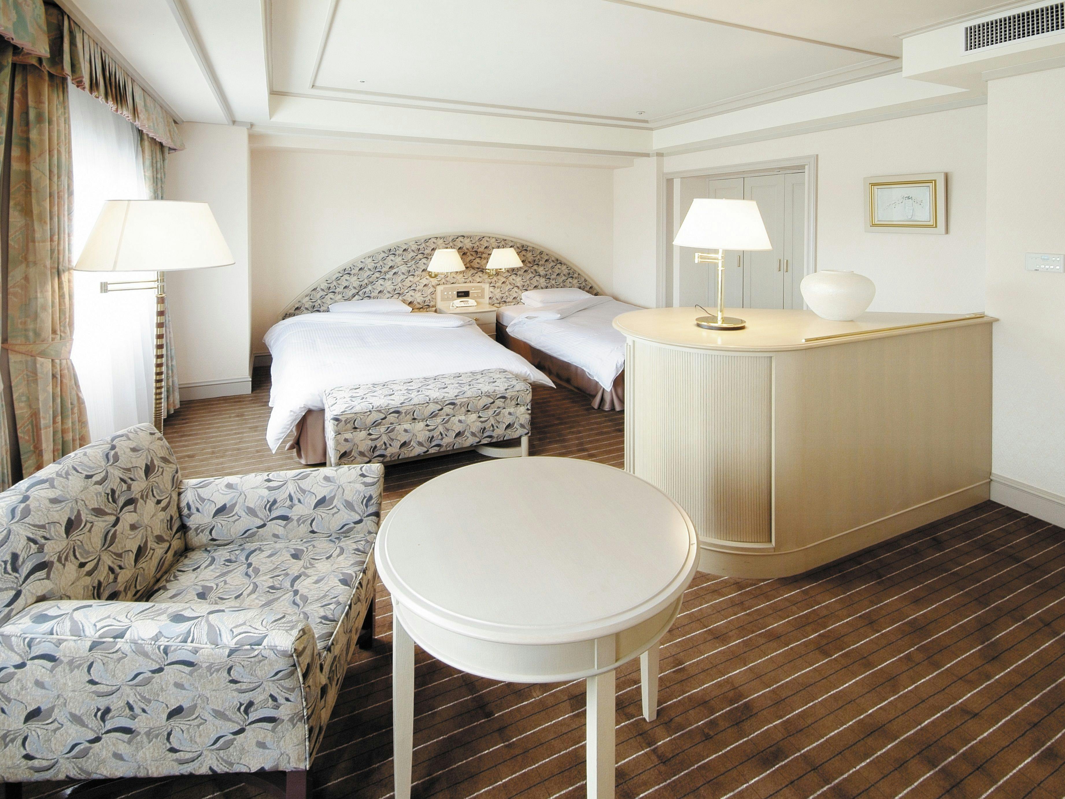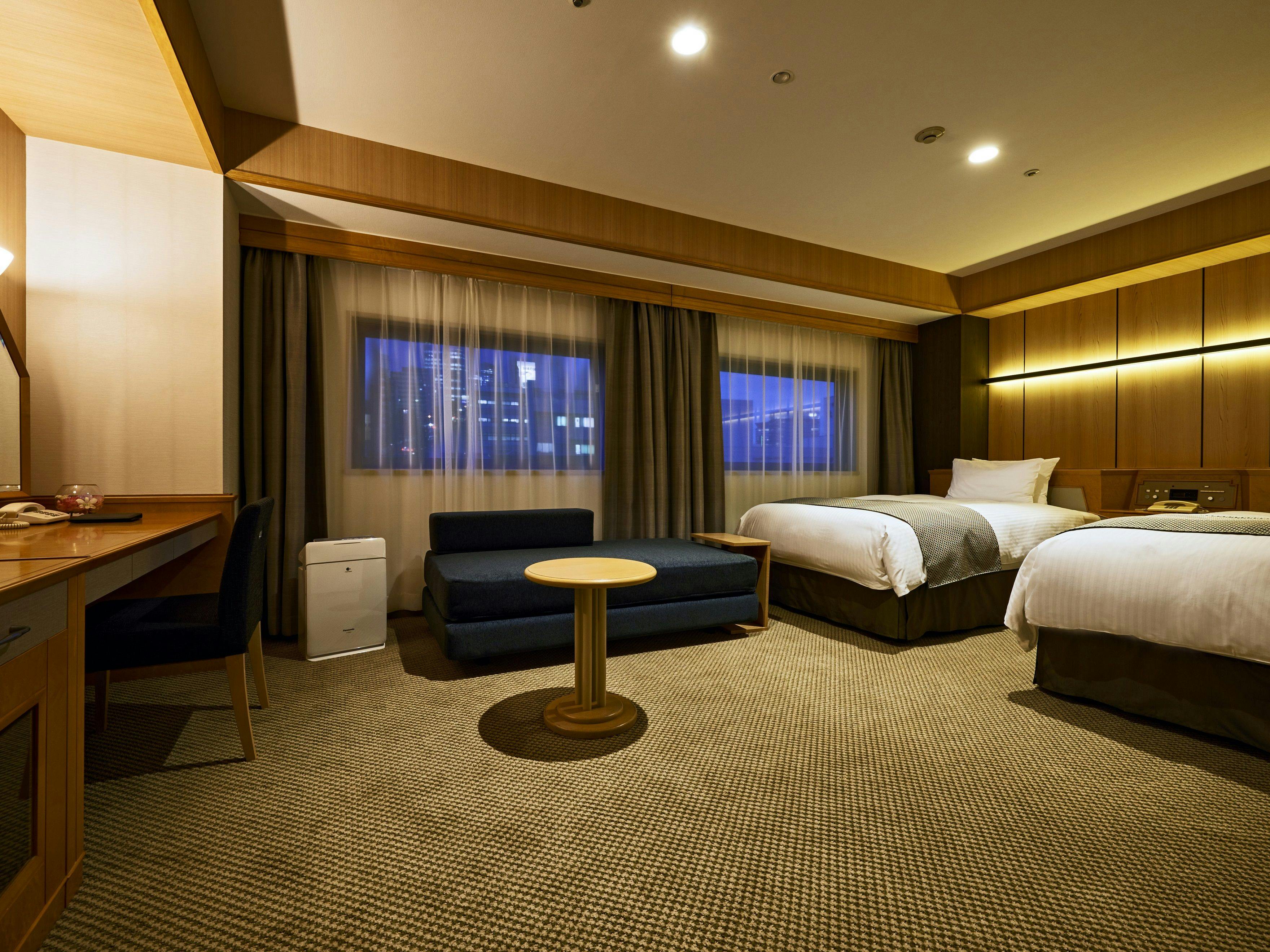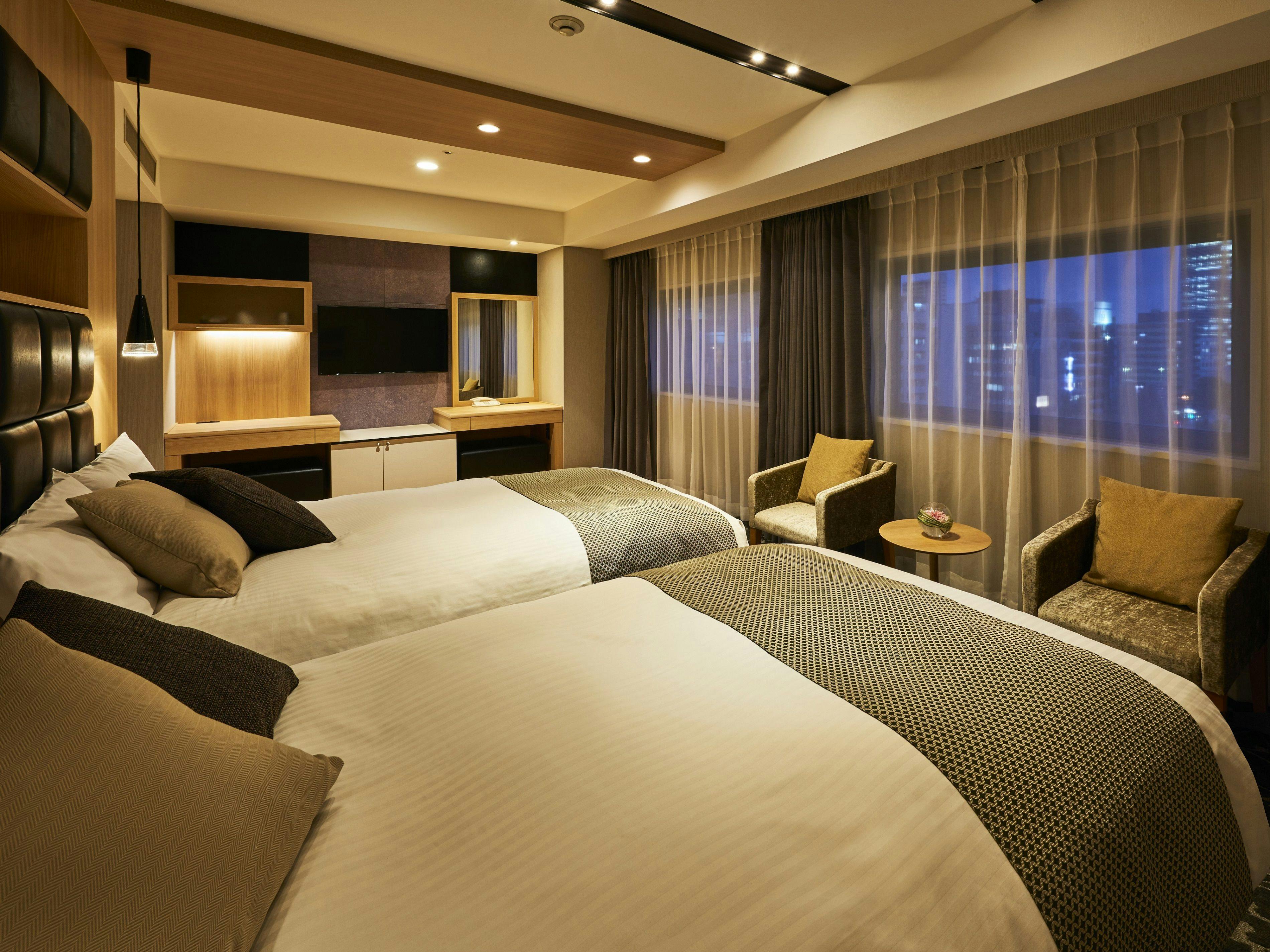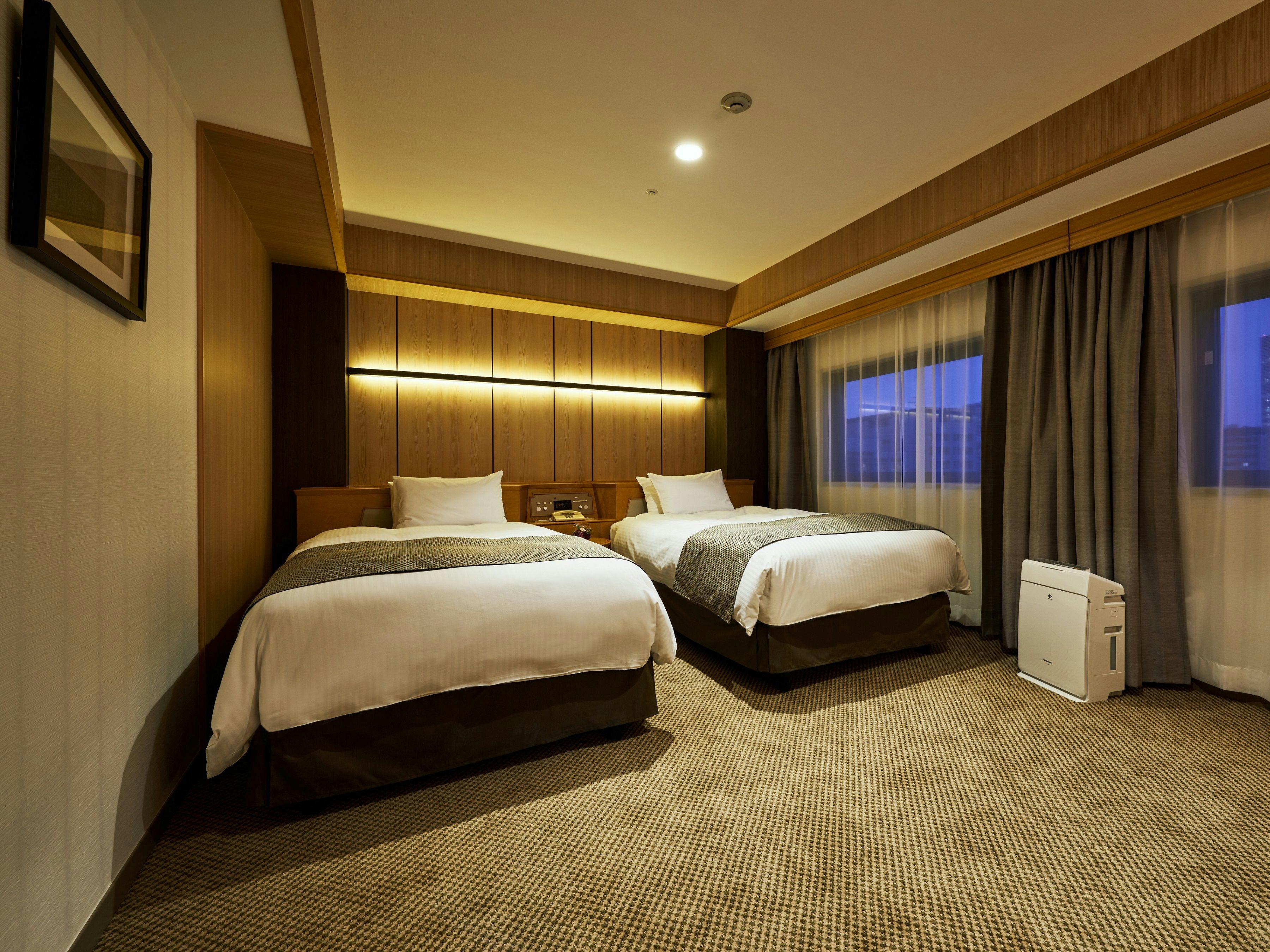 コーナーダブルの空間をツインでもご利用いただけるようベッドを配置致しました。■2017年リニューアル■シングルベッド(幅90cm)×2台■角部屋■広さ21平米■32型液晶TV(壁掛け)