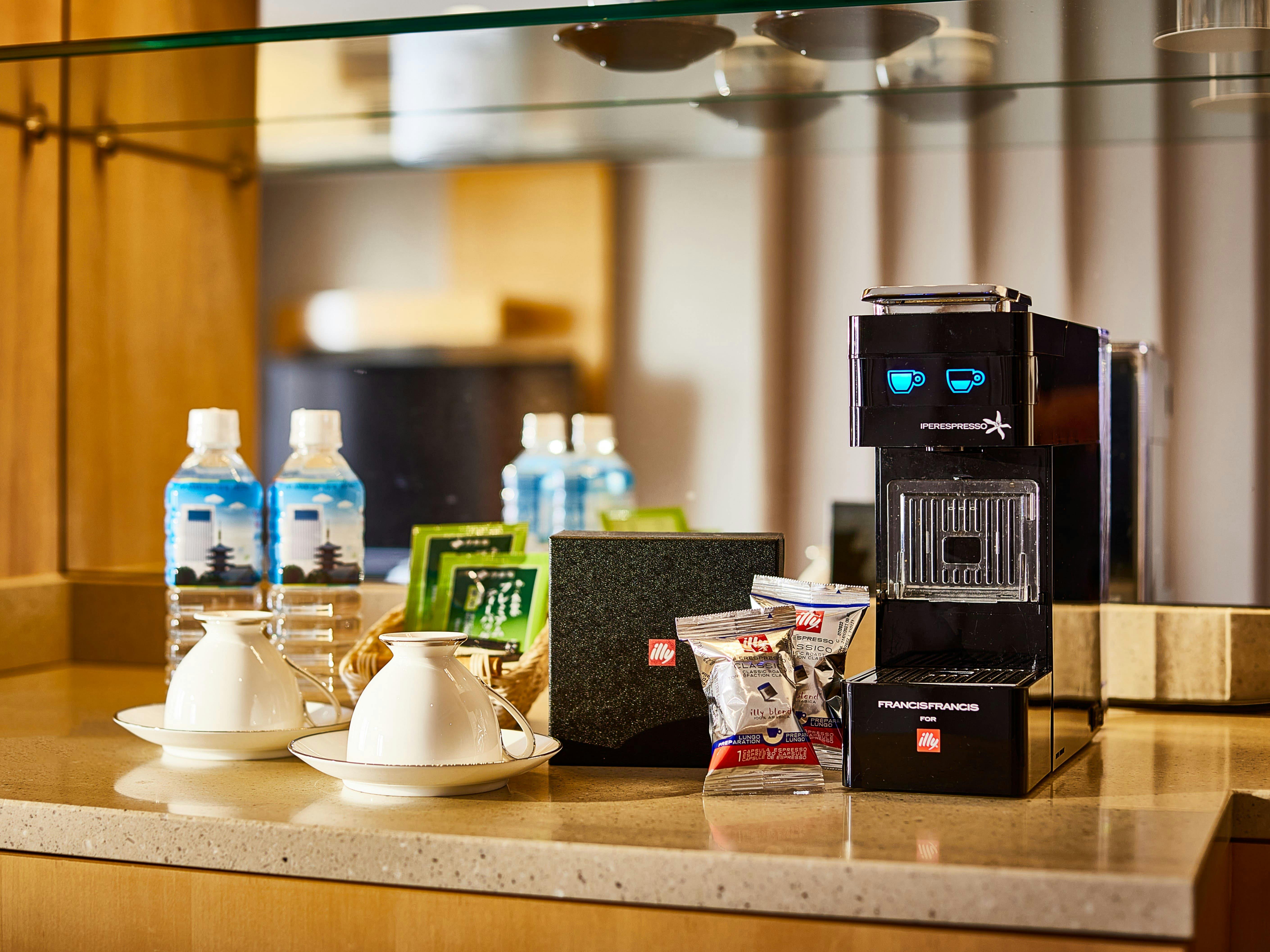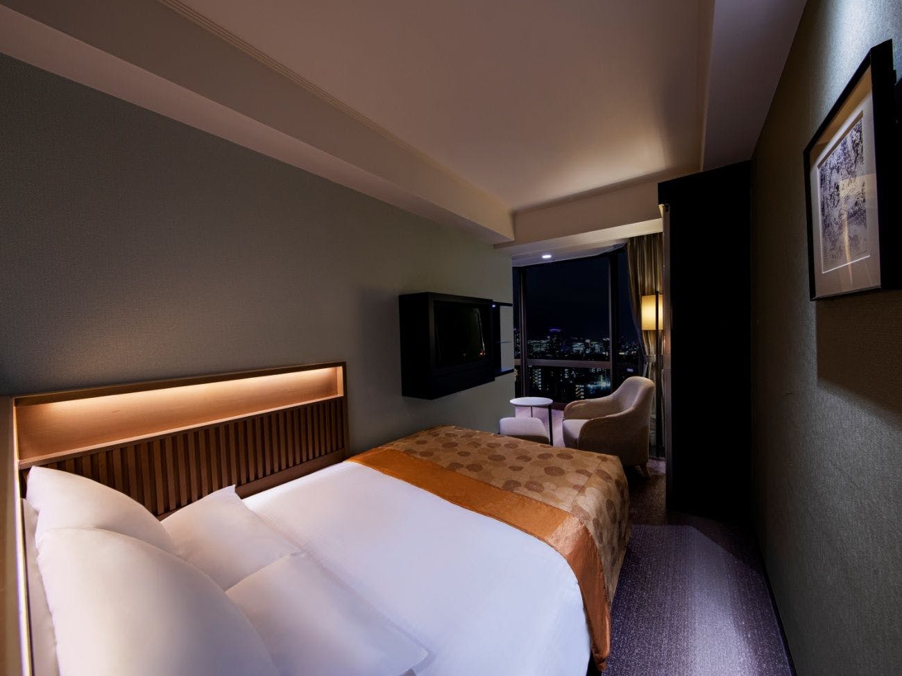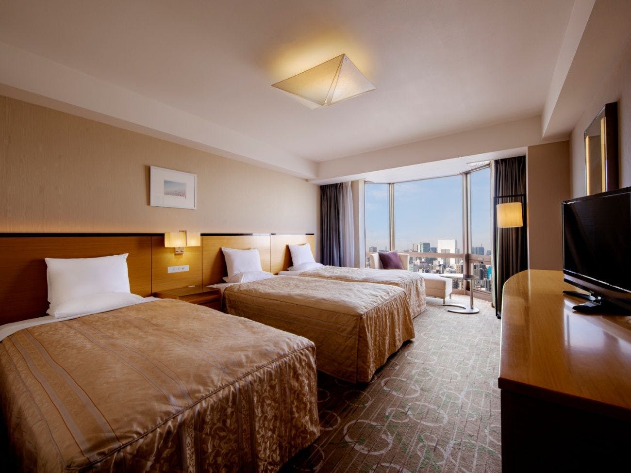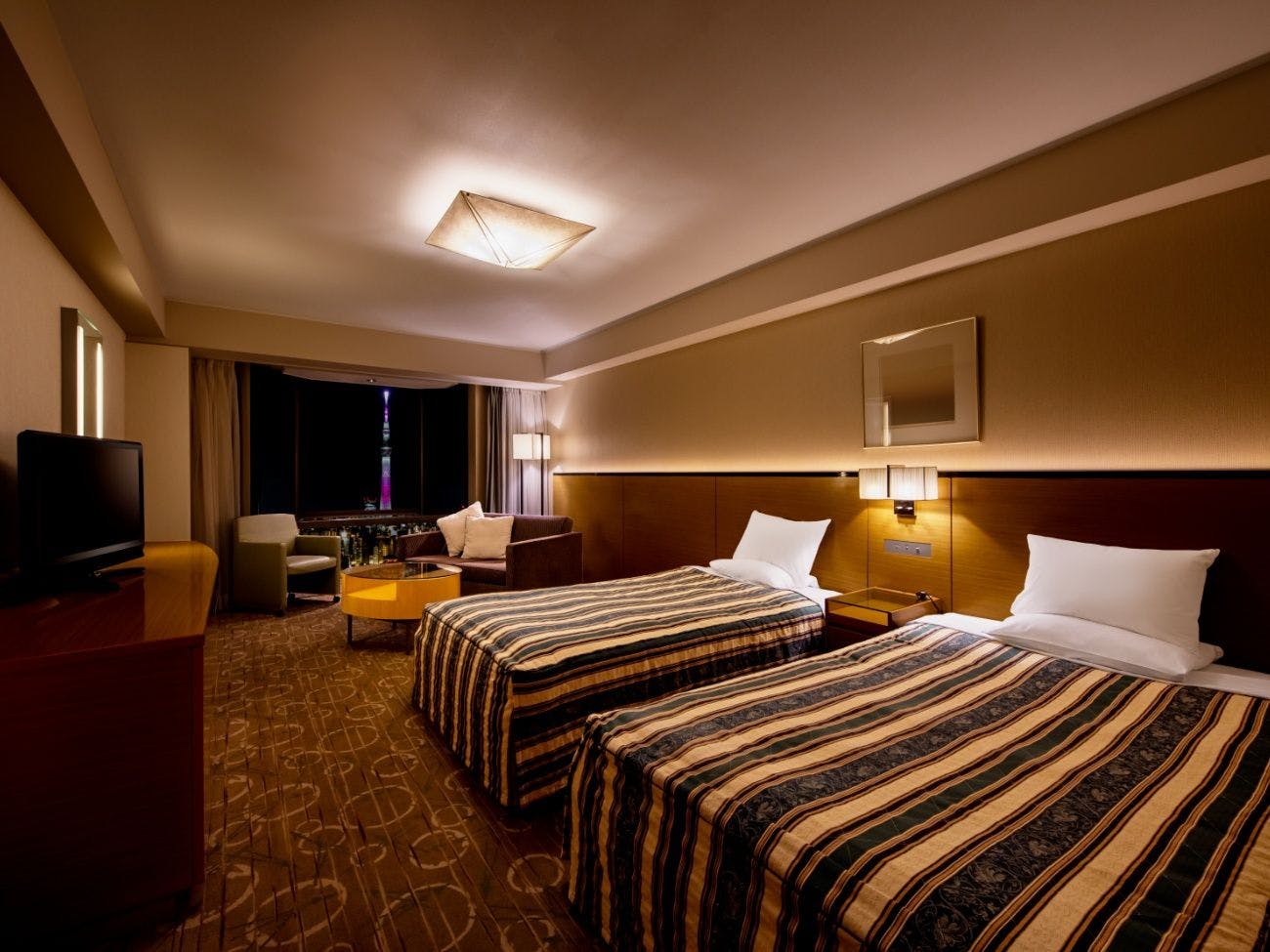 26平米のツインルーム。客室内にバーカウンターがあり、浅草寺や東京スカイツリー(R)がご覧いただけます。