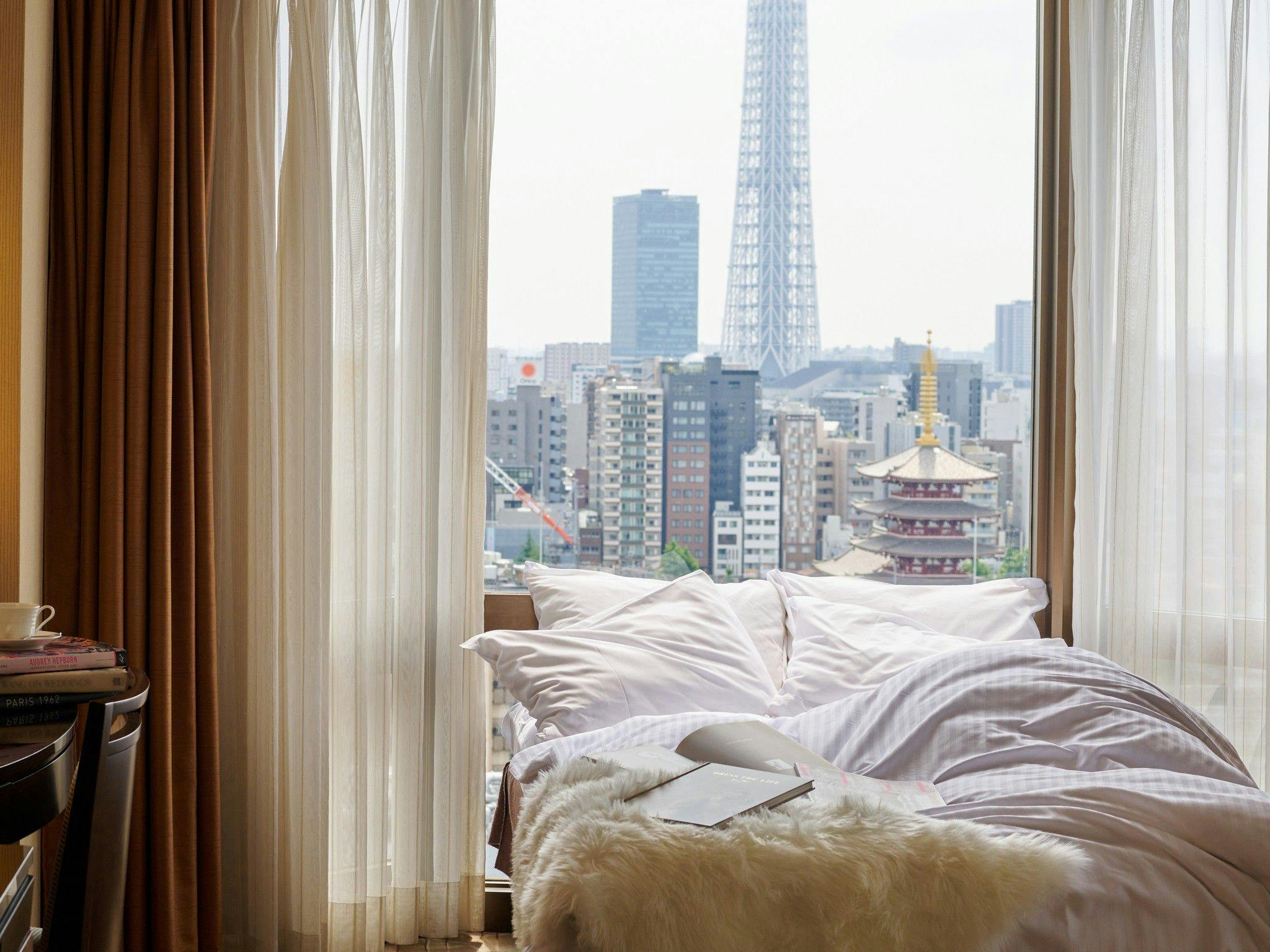 天空のベッドの外では、東京スカイツリーと浅草を一望できる当ホテルならではの景色が広がります。