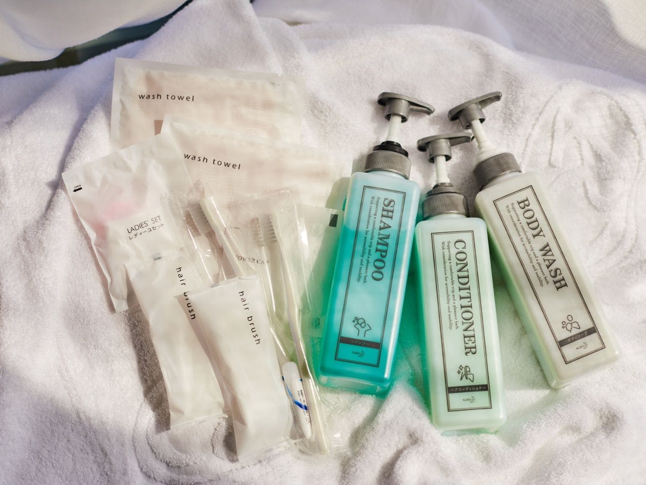 バスタオル・フェイスタオル・シャンプー・リンス・ボディソープ・歯磨きセット・ナイトウェア・シェーバー・シェービングクリーム・コットン・シャワーキャップ・ヘアゴム・クシ・使い捨てスリッパ