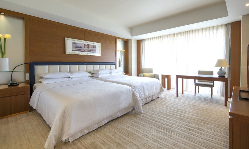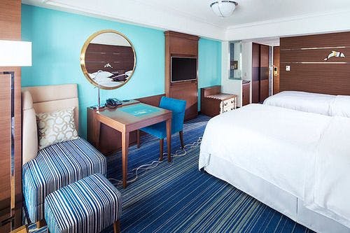 おくつろぎに最適な広々としたベッドルームは、木製のポケットドアでプライバシーを確保しております。また、椅子と無料のワイヤレス高速インターネットアクセスを完備したエグゼクティブワークデスクで、お仕事をこなしていただけます。ベッドルームには、液晶テレビと、静かなひとときをお過ごしになるのに理想的な居心地の良いアームチェアのほか、最高の眠りを毎晩お届けする豪華なシーツとふかふかの羽毛布団で整えた、ダブル2台のシェラトンシグネチャー・スリープエクスペリエンスベッドがございます。アップスケールなバスルームには、ワンランク上のバスアメニティーのほか、ガラス張りのシャワーと独立した深めの円形バスタブ(スイートの内1室はジェットバスをご用意)などの豪華な設備を施しております。