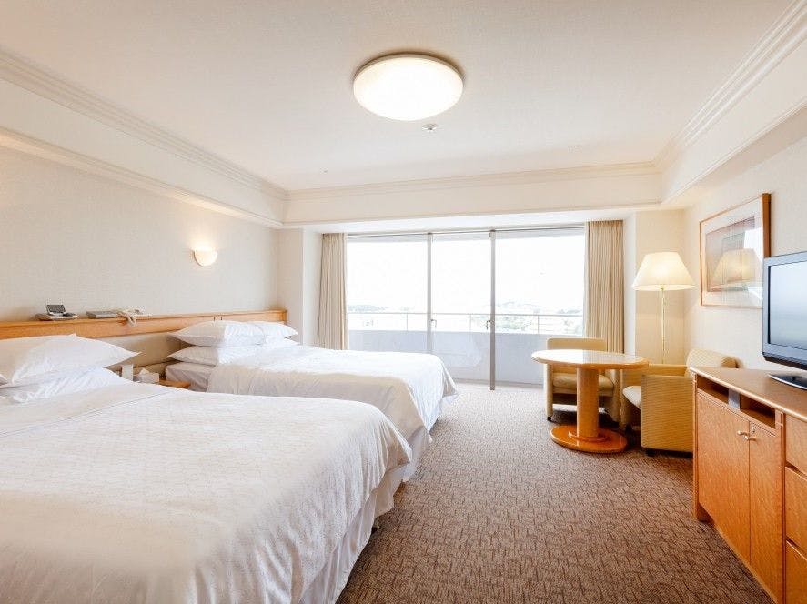 マリンブルーとライトブラウンの明るく爽やかな色調でコーディネートされ、大きな窓やバルコニー越しに見えるパークや東京ベイなどの眺めとともに開放感たっぷりのひとときをお届けします。窓辺にはテーブルとアームチェア2脚が置かれ、降り注ぐ陽光につつまれてゆっくりとお寛ぎいただけます。さらに、充実した一日の締めくくりには、広々と使えるダブルサイズ2台の“シェラトン シグネチャー スリープ エクスペリエンス ベッド”ならではの、素晴らしい寝心地をお楽しみいただけます。