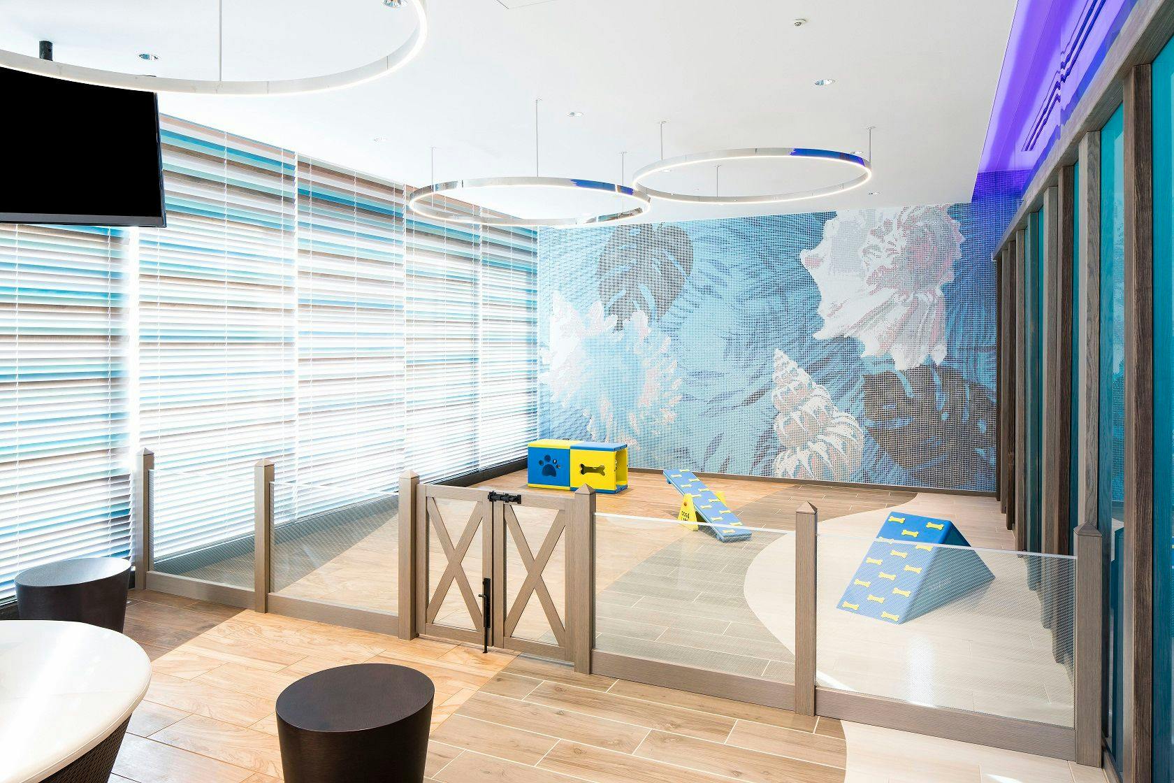 新館のパークウイングには、ワンちゃんと一緒に泊まれる客室・ドッグフレンドリールームがあります。大切な愛犬と快適なシェラトンリゾートステイをお楽しみいただけるよう、ドッグベッドをはじめ、ドッグマット、フードボウル、トイレシート&トレイ、ダストボックス、消臭スプレー、粘着クリーナー、空気清浄機といった充実のペットアメニティーをご用意。ワンちゃんのためのインルームダイニングメニューも取り揃え、さらにこのお部屋の特典として、愛犬のエチケットサービス(お尻のケア、ネイルカット、イヤークリーニング、ブラッシング)を無料でご利用いただけます。洗い場付きのバスルーム、マルチメディアハブなどの装備も整え、お客様と愛犬にアットホームな雰囲気につつまれた寛ぎの時間をお届けします。