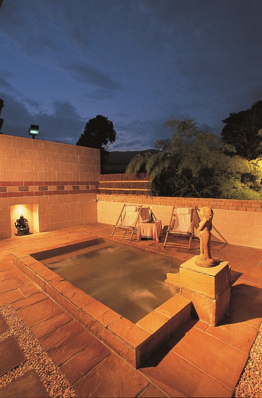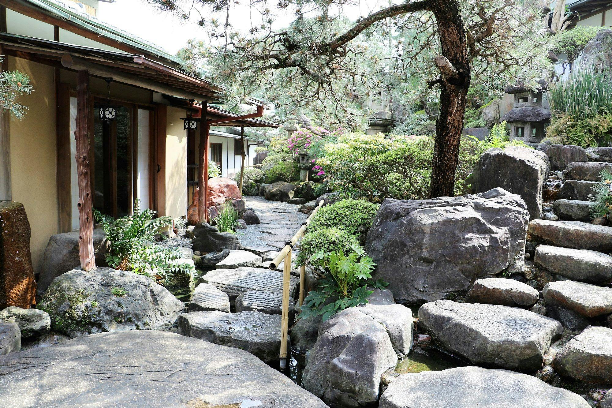 石畳で結ばれた石庭に点在する数奇屋造りの離れ客室。