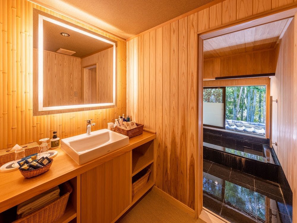 お部屋は、床・天井・階段の細部に至るまで天然木のみを使用し、和室以外のフローリング及び半露天風呂にはヒーリング効果のある青森ヒバを使用。