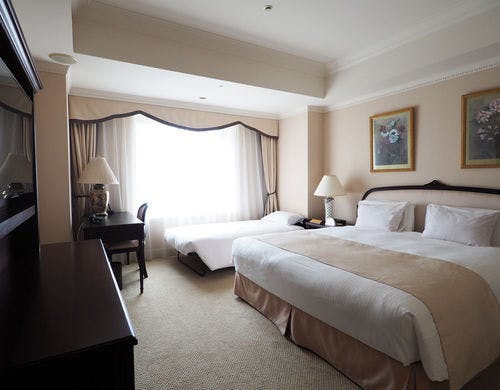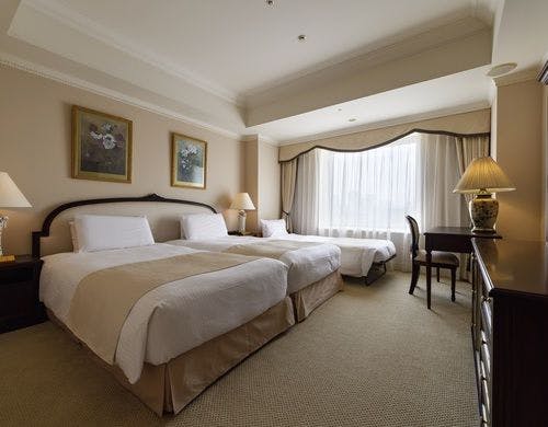 広めの室内に落ち着いた色調のインテリア、ゆとりあるサイズのベッドが置かれ、さらに広々としたバスルームの窓からは都会の眺望をお楽しみいただけます。こちらのお部屋は隣室のデラックスコーナーツインとコネクティングしてのご利用が可能です。
