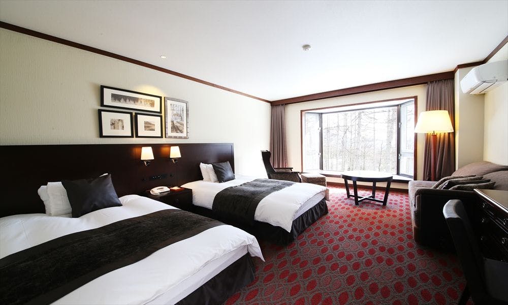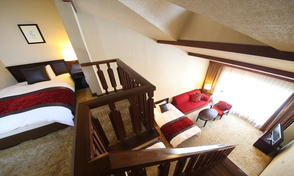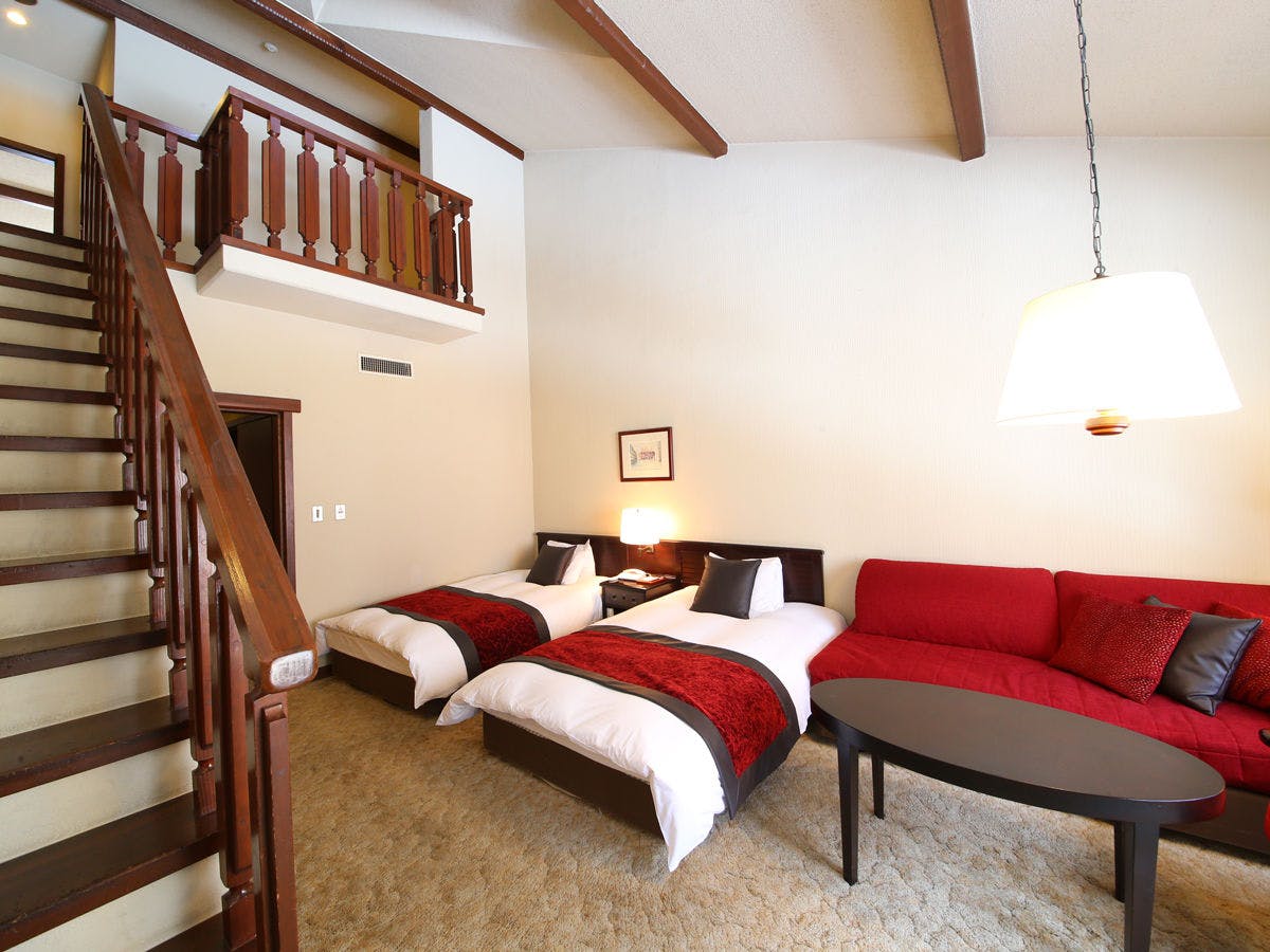別荘感覚でくつろげる2層吹き抜け空間は、プライバシーと開放感を兼ね備えた、ゆとりと温もりを感じられる、ご家族、グループ向きのゲストルームです。森の呼吸を窓辺に感じながらお過ごし頂けます。※客室内は仕様が異なる場合がございます