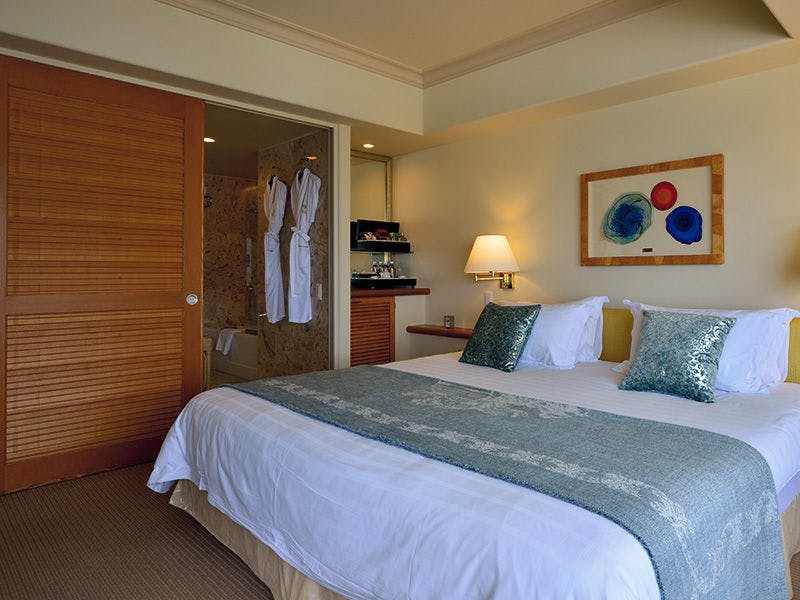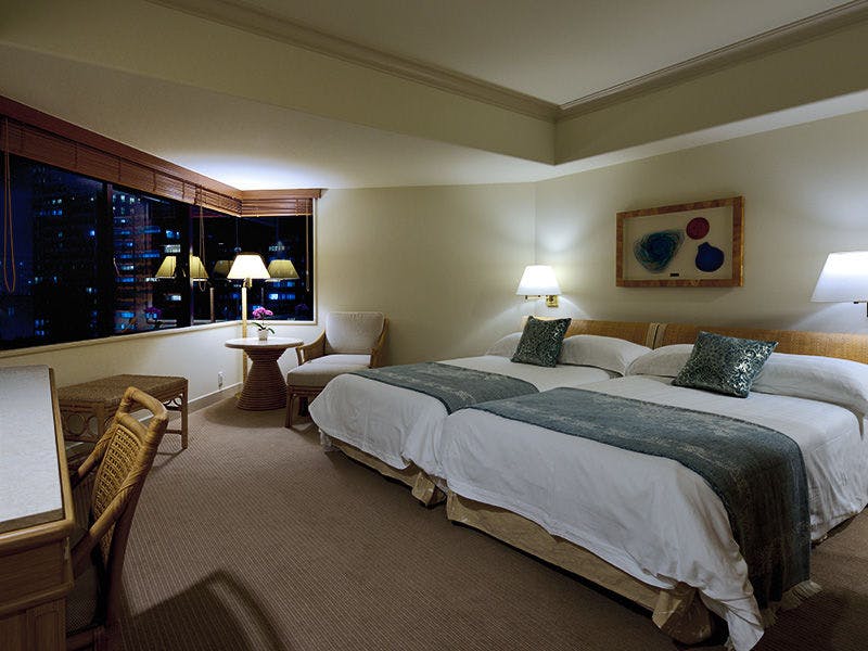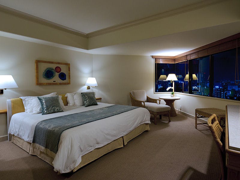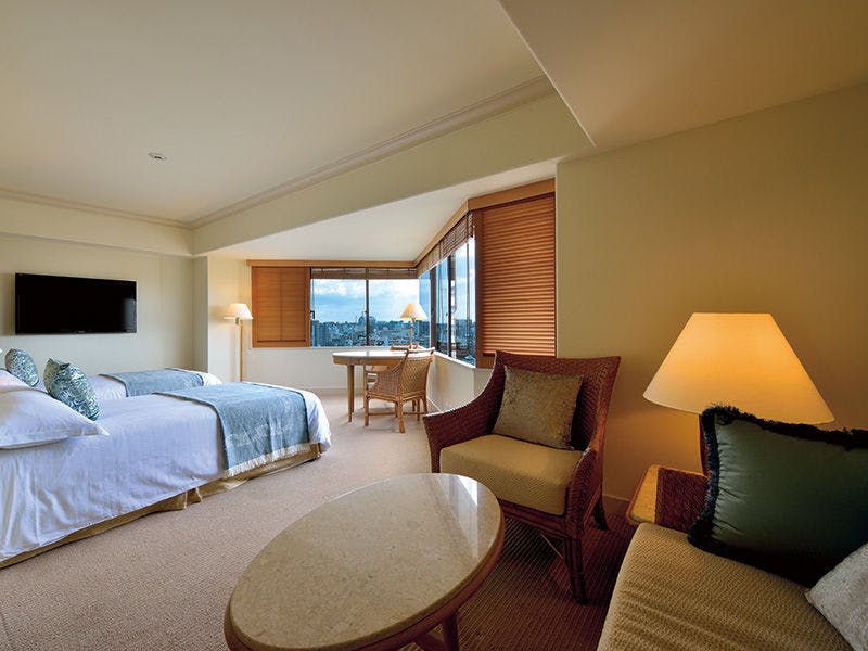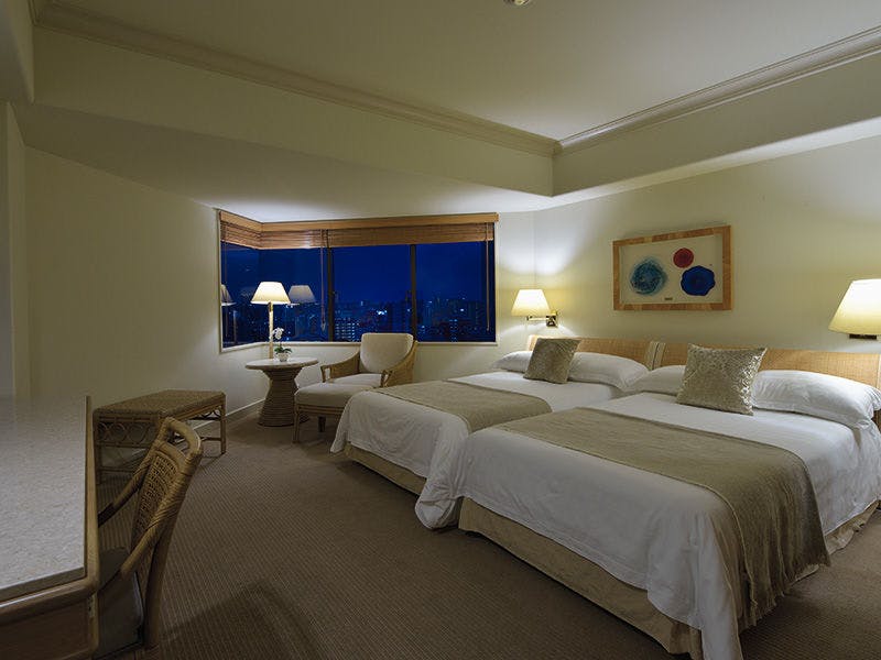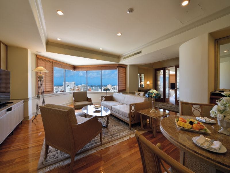 エレガントさと南国リゾートのエッセンスが溶け合う極上のスイートルーム。開放感に満ちたゆとりの空間、コーナーの大きな窓から那覇の夜景を一望する美しい眺望が贅沢な時間を演出いたします。