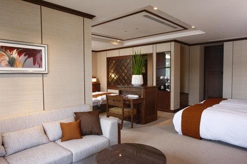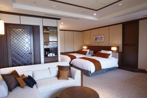 スタンダードツインの約1.5倍とゆとりのある広さで、ご家族はもちろん、親しいお仲間同士でもゆったりお寛ぎいただけます。