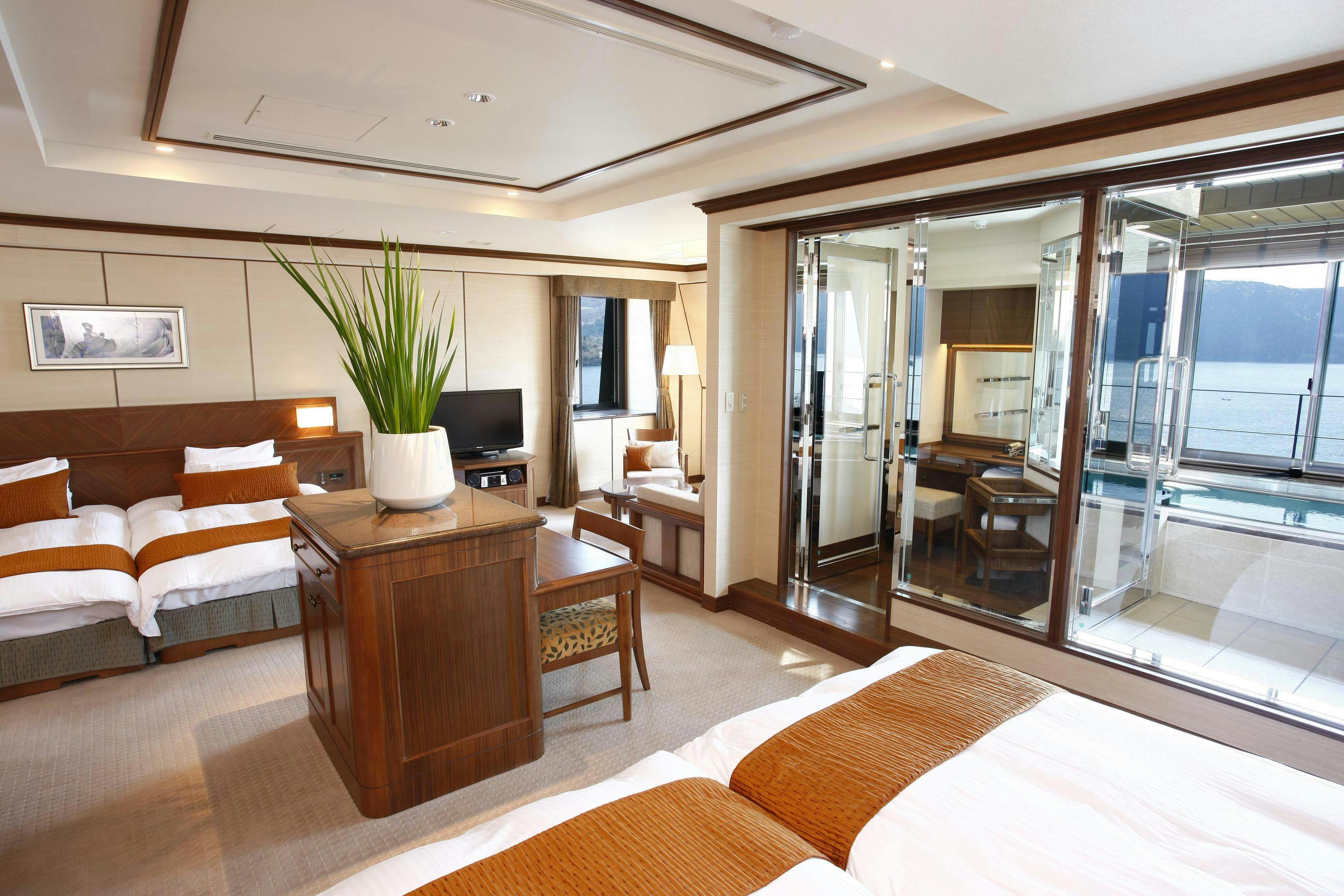 山のホテル最上階にあるプレミアムゾーンに位置し、芦ノ湖を一望できる温泉ビューバスを備えたプレミアムルーム。