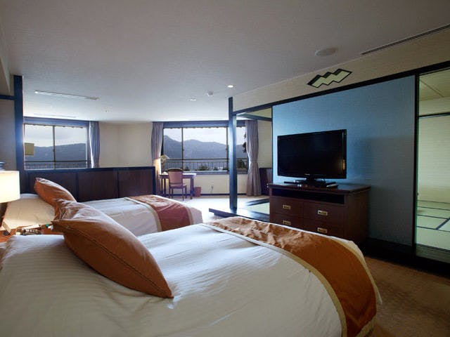 ベッド 2台(幅125cm × 長さ200cm)/バス(温泉)/トイレ(ウォシュレット)/テレビ/冷蔵庫/電気ポット/Wi-Fi/CD・DVDプレーヤー/体重計/お茶セット(フレーバーグリーンティー・緑茶・ほうじ茶・ホテルオリジナルドリップコーヒー)/ドライヤー/貴重品金庫/加湿器(冬期)
