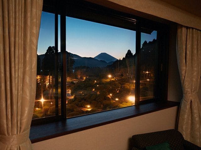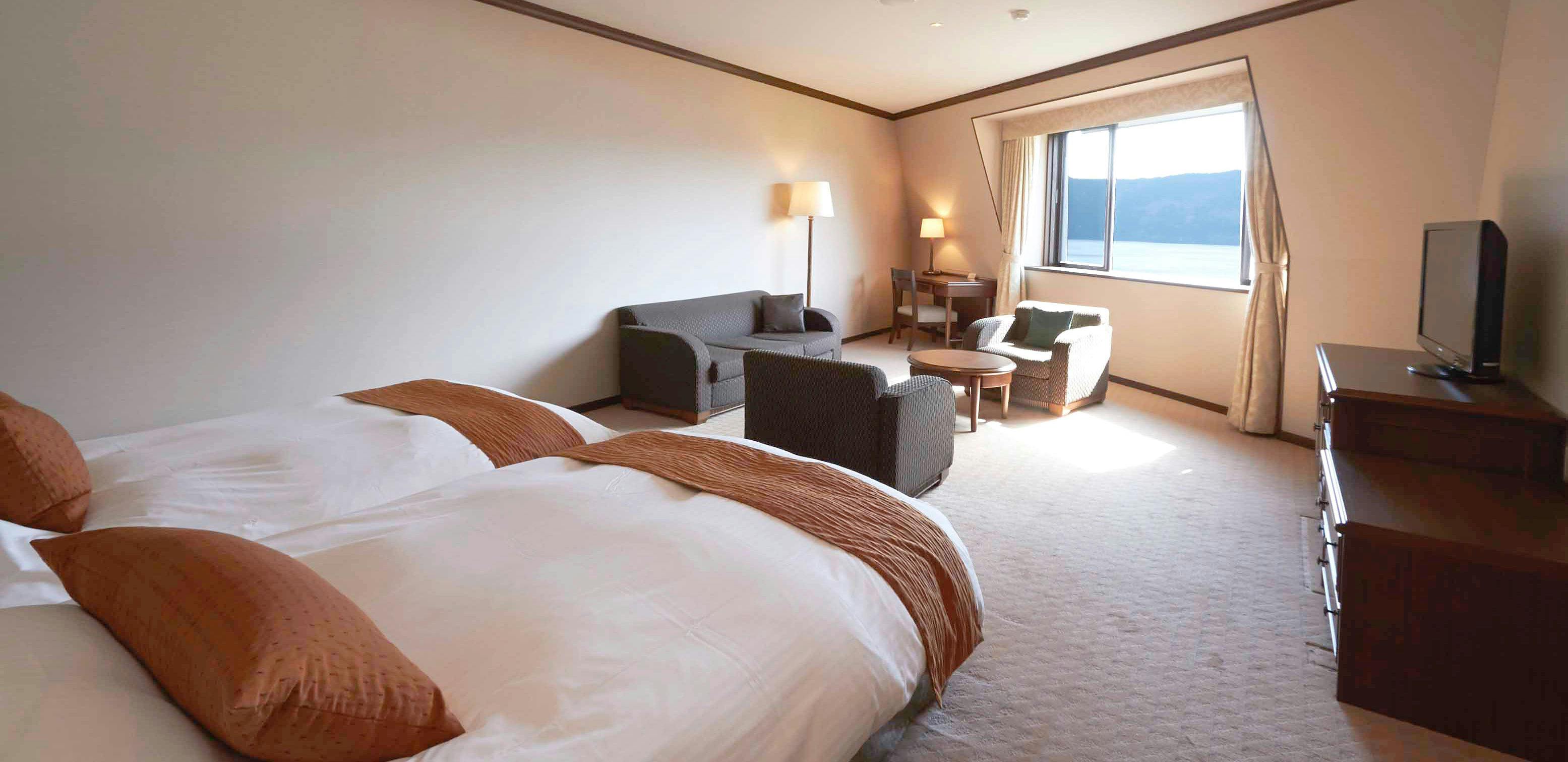 「デラックスツイン」は、窓の向こうに広がる大庭園、芦ノ湖、そして悠然と佇む富士山を一望できます。