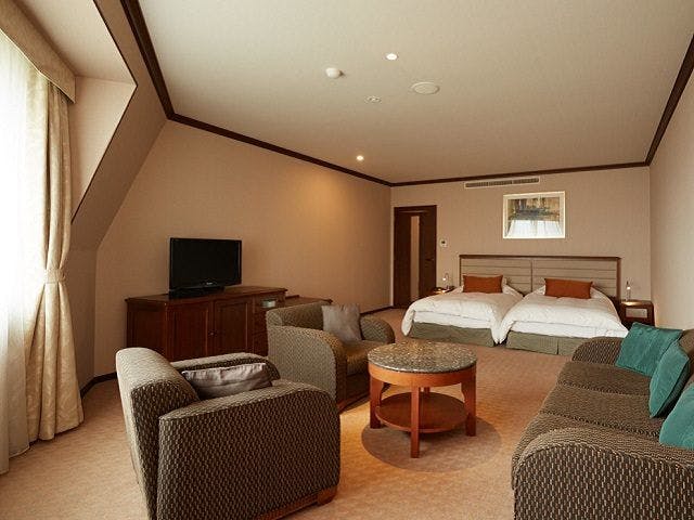 ベッド 4台(幅115cm × 長さ200cm)/バス(温泉)/トイレ(ウォシュレット)/テレビ/冷蔵庫/電気ポット/Wi-Fi/CD・DVDプレーヤー/体重計/お茶セット(フレーバーグリーンティー・緑茶・ほうじ茶・ホテルオリジナルドリップコーヒー)/ドライヤー/貴重品金庫/加湿器(冬期)
