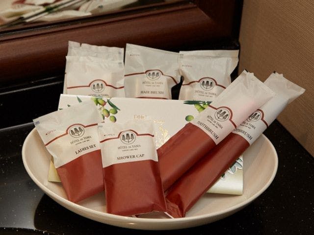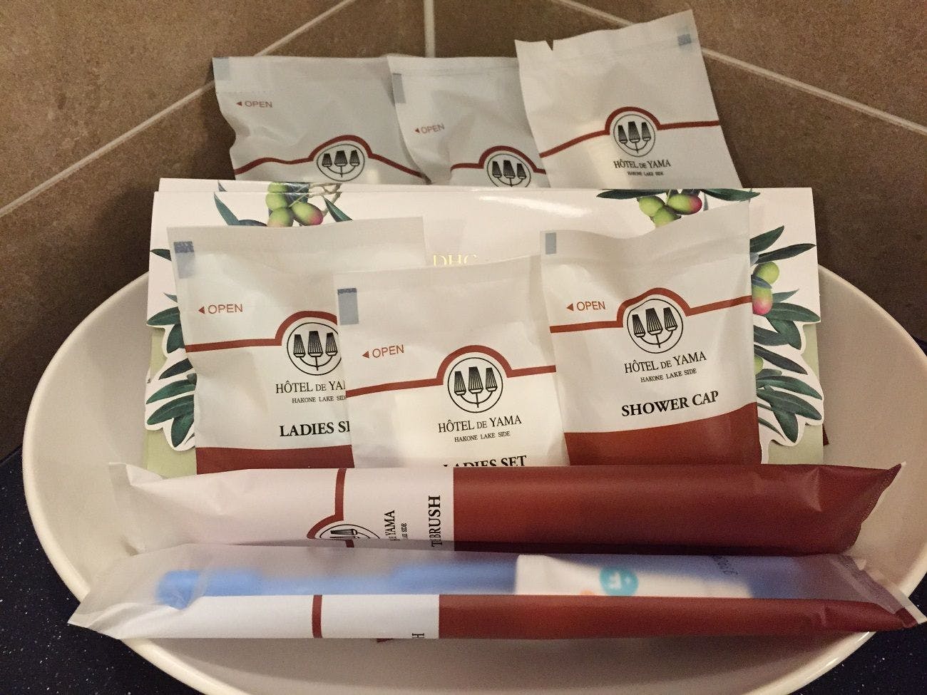 歯ブラシ/石鹸/シャンプー/リンス/ボディソープ/カミソリ/シャワーキャップ/ブラシ/レディスセット(綿棒、コットン)/DHC基礎化粧品(洗顔、クレンジング、ローション、美容オイル)/スリッパ/浴衣/茶羽織/新疆綿のハンド・フェイス・バスタオル