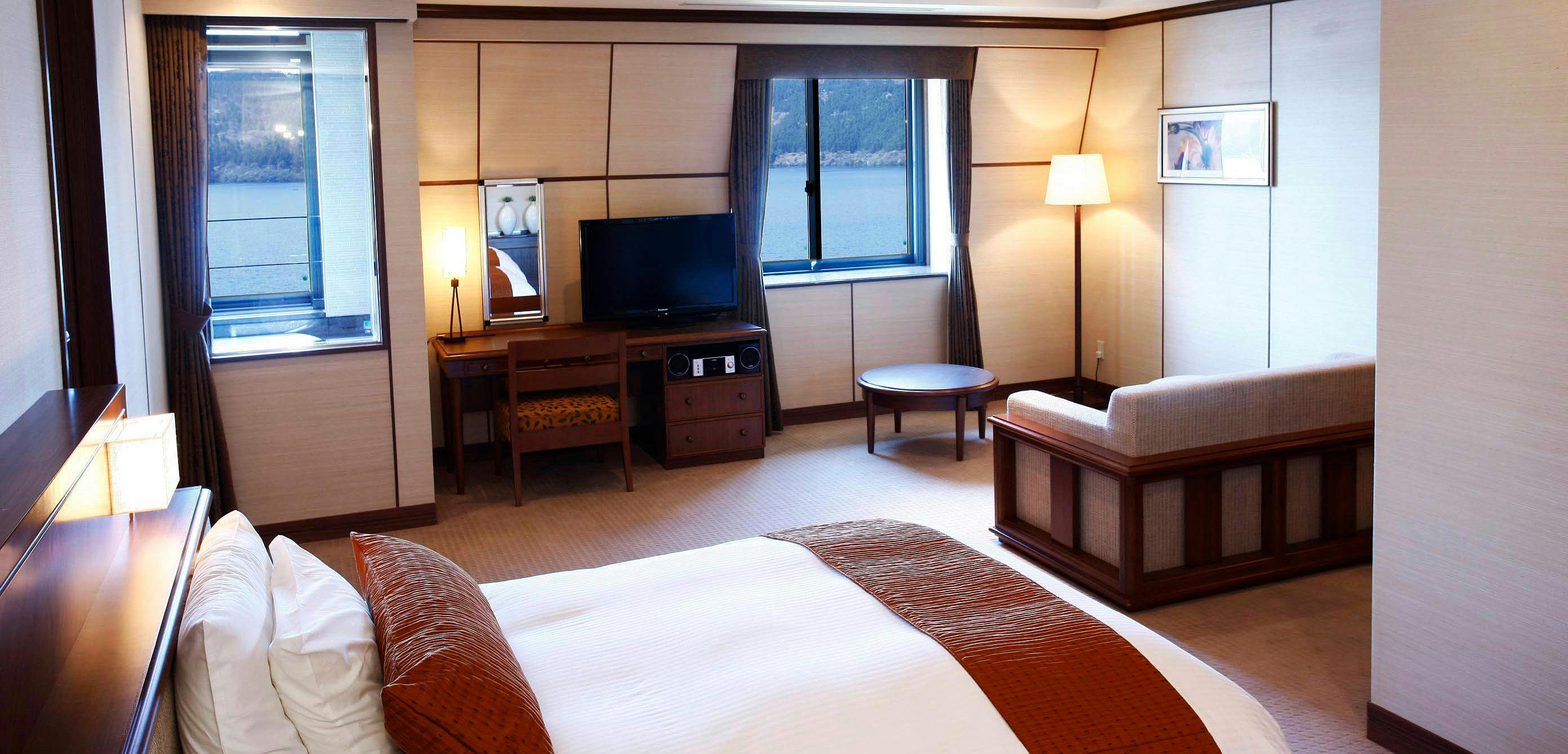 山のホテル最上階プレミアムゾーンの一番奥に位置する、コーナータイプのフォースルーム。芦ノ湖が一望できる温泉ビューバスを備えたプレミアムルーム。