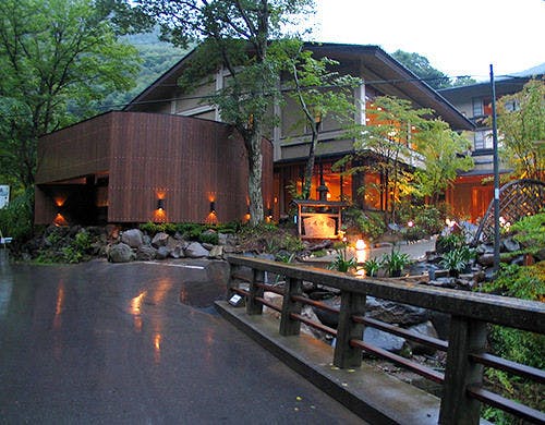 国定公園の中にある明神館。二つの川に挟まれるパワースポットとして