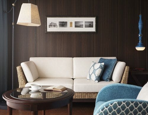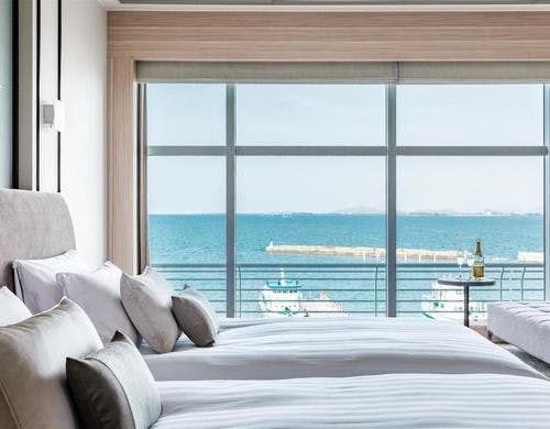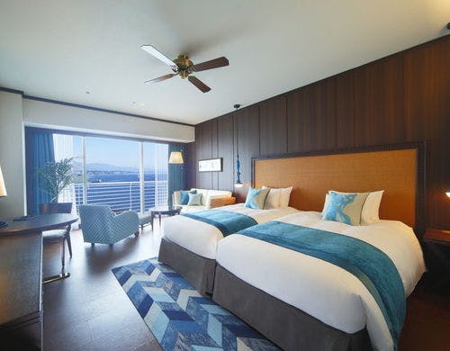 「水」をテーマにブルーカラーを基調とした客室は素足のままお過ごしいただける通気性の良いコルクタイルの床、自然の風を取り入れ空気を循環させるシーリングファン、程よいボリュームとクッションのシモンズ製マットレスにより、ソフトで快適な寝心地をお約束。