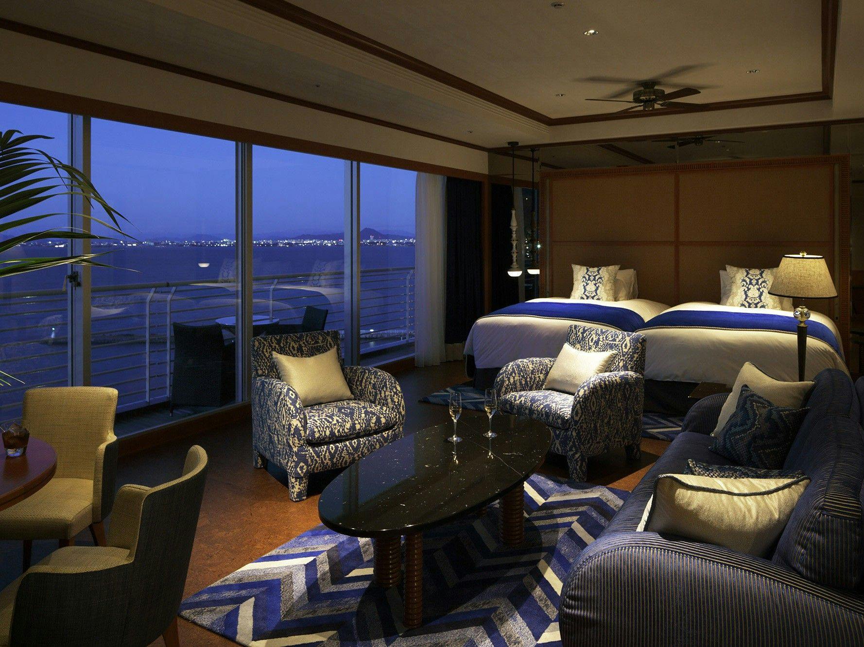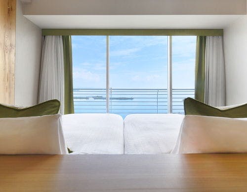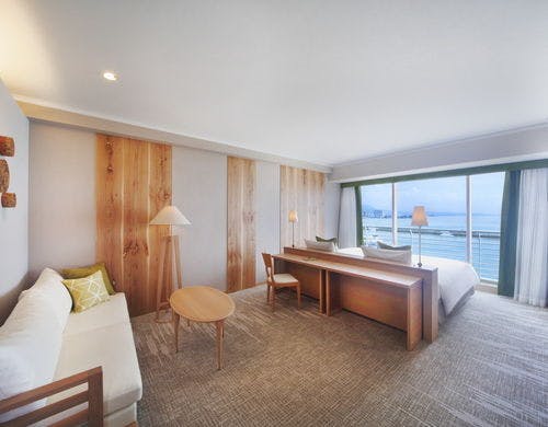 ベッドを琵琶湖に向けて配し、リビングとベッドルームに境があるジュニアスイートのような空間。スイートルームのように、ベッドで休む時間以外も快適にお過ごしいただけます。洗面スペースにはベーシンが2つあり、グループ利用時の身支度に便利です。