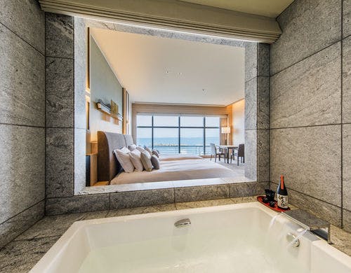 湖国の迎賓館として育まれた琵琶湖ホテルの 伝統と、眼下に広がる雄大な琵琶湖、それを取り巻く豊かな自然・文化に触れていただき、ゆったりとした時間が流れるひとときをご提供するため、“エアリーバス(ビューバス)”を導入しました。(“エアリーバス”とは、ベッドルームとの空間が一体化したビューバスです。)