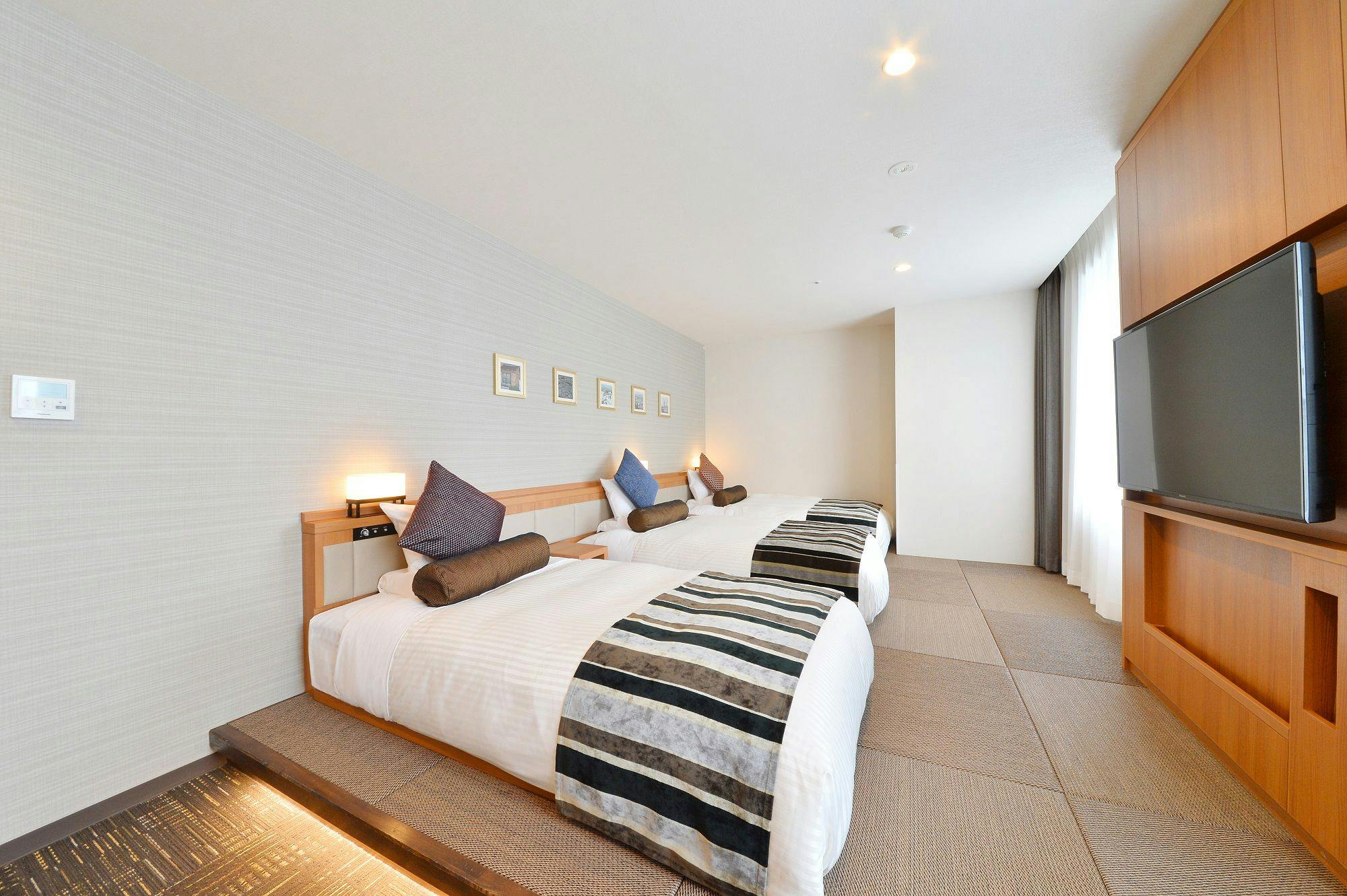 ・本館 ・広さ:27平米 ・ベッド幅:110cm 2台ベッドサイドは琉球畳を使用しており、和モダンなイメージのお部屋です。・43型液晶テレビ・無料コーヒーマシン付き・全室加湿器付空気清浄機完備・インターネット接続無料(Wi-Fi接続のみ)