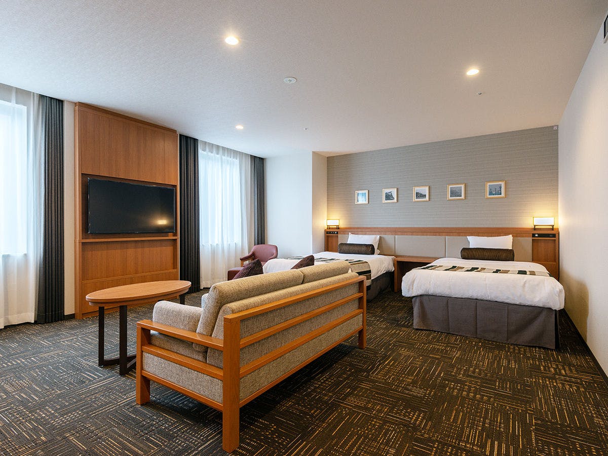 ・東館 ・広さ:46平米 ・ベッド幅:120cm 2台+ソファベッド1台広々した贅沢な空間で、ゆったりお過ごしいただけます。・43型液晶テレビ・バス・トイレ別・無料コーヒーマシン付き・全室加湿器付空気清浄機完備・インターネット接続無料(Wi-Fi接続のみ)